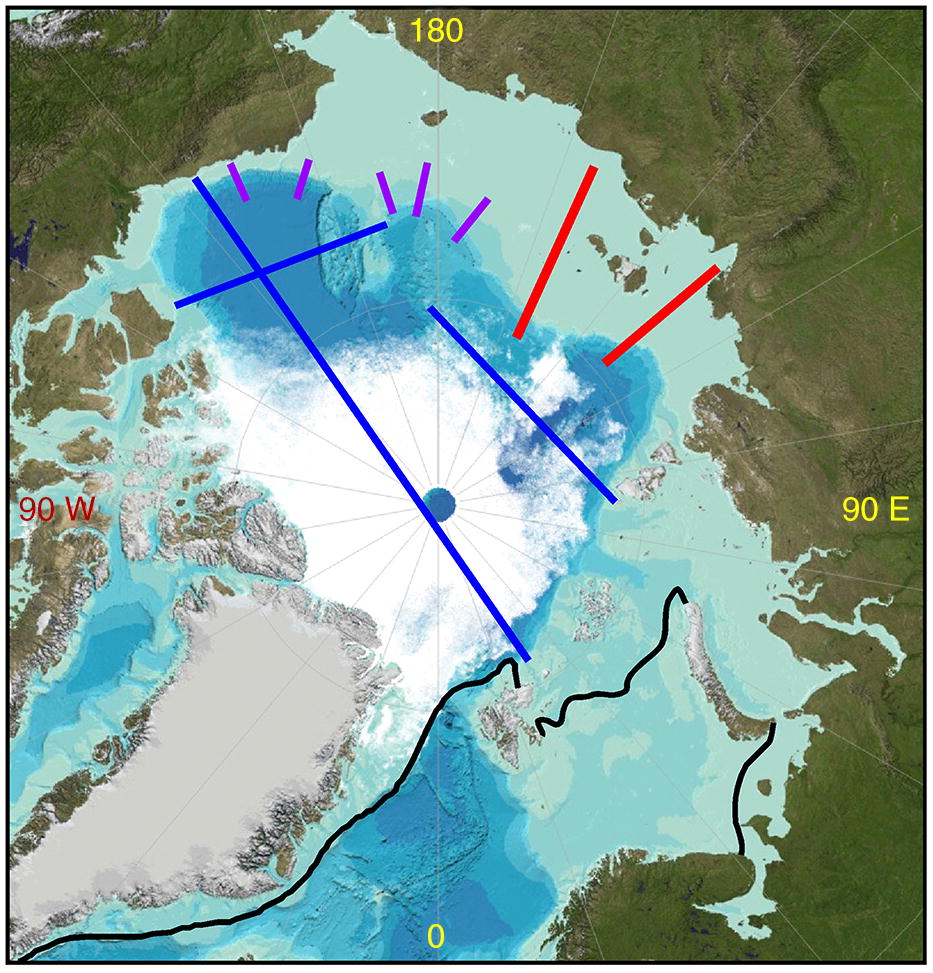 Map with suggested transects for the study of the Arctic Ocean carbon system: red for following the land, burgundy for studying the boundary current contribution and blue for the central basins. Illustrated are the sea-ice conditions at the minimum in September 2012 (white shading) and with maximum in March 2012 demarcated by the black lines.
