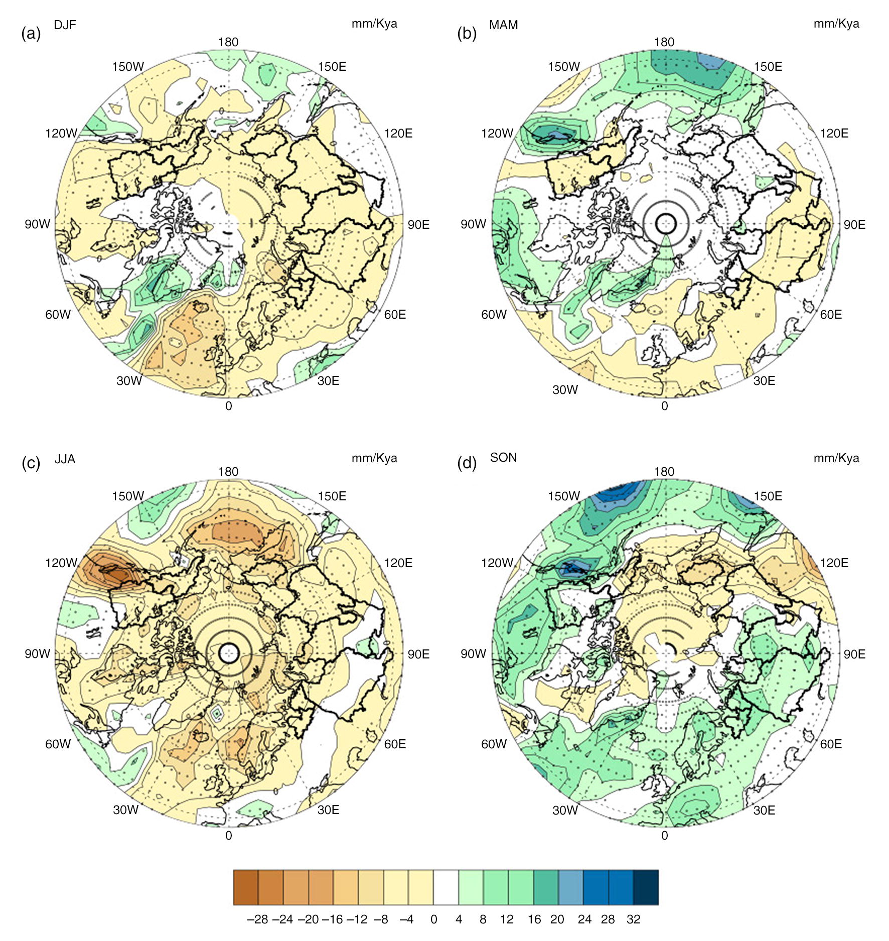 Trends in precipitation (mm/Ky) between the middle Holocene and 1800 AD (pre-industrial period) for (a) winter (December–January–February), (b) spring (March–April–May), (c) summer (June–July–August) and (d) autumn (September–October–November). Source data from Wagner et al. (2011). A coupled atmosphere–ocean general circulation model, ECHO-G (Legutke & Voss 1999), was used to produce the simulation. Trends are calculated using a Mann Kendall Sen slope analytical approach (Yue et al. 2002). Trend strength is shown with colours ranging from negative values (brown/yellow tones) to positive values (green/blue tones). Significance is denoted by black circles to represent the 95% confidence interval. Major basins as shown in Fig. 2 are also illustrated.
