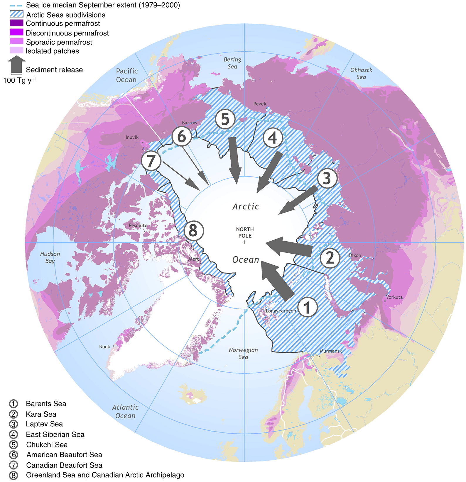 Modern sediment contribution (Tg y−1) from coastal erosion into the Arctic Ocean divided by marginal sea areas (after Brown et al. 2002).