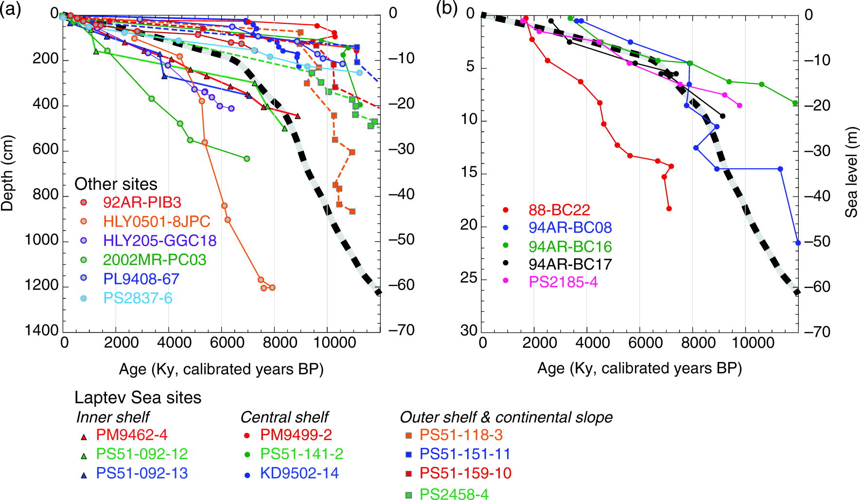 Global sea level (black and grey dashed line) and published radiocarbon based sedimentation rates in the Arctic. Calibrated radiocarbon data are from Jakobsson et al. (2014) and for the Laptev Sea, Bauch et al. (2001). A subset of available cores was selected where enough radiocarbon dates exist to distinguish between early and late Holocene sedimentation rates. (a) High sedimentation rates are found on continental shelves and slopes across the Arctic, and where dates extend to the base of the Holocene, most seem to capture a period of high sedimentation associated with rapid sea-level rise lasting until 7 Kya. (b) In lower sedimentation rate areas, this trend is not clearly captured by existing records. See Fig. 1 for core locations.