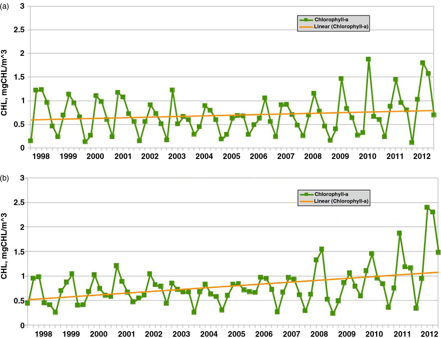 Satellite-derived chl a expressed as monthly mean values for April to August from 1998 to 2012 for the EGC and WSC regions showed the typical seasonal variation (Fig. 2). However, the two regions showed slightly different variability and trends. In the EGC, the highest chl a concentration occurred in May or June, except in 2006, when the maximum concentration was reached in July. In the WSC, chl a peaked in June and July during the 2002–09 period; before and after that period, maximum chl a values were also reached during May or June. Overall, there was no significant trend of increase in chl a concentration in the EGC region (+0.19 mg chl a m−3 over all years; p value: 0.14), but the seasonal variability increased in recent years and the maximum chl a concentrations increased to values ranging between 1.5 and 2.0 mg m−3 for the period between 2009 and 2012, in contrast to 1–1.5 mg m−3 from 1998 to 2003, and 0.7–0.9 mg m−3 in 2002, 2004 and 2005. Whereas no significant increase in the chl a concentration was observed in the EGC, a significant increase of chl a (+0.54 mg m−3) occurred in the WSC (p<0.01) from 1998 to 2012. In both regions, the seasonal cycle (range between minimum and maximum chl a) was significantly enhanced after 2008 (Fig. 2).