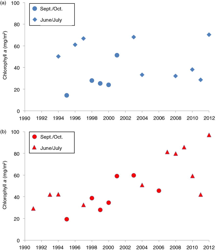 Fig. 3 Phytoplankton biomass expressed as integrated chlorophyll a values for the upper 100-m water column given as mean for all stations occupied in the respective year from 1991 to 2012 in (a) the East Greenland Current and (b) the West Spitsbergen Current. Samples were taken in June/July for the years 1991, 1994, 1997, 2000, 2001, 2004 and 2007–2012 and in September/October for the years 1995, 1998, 1999, 2000, 2001, 2003 and 2006.