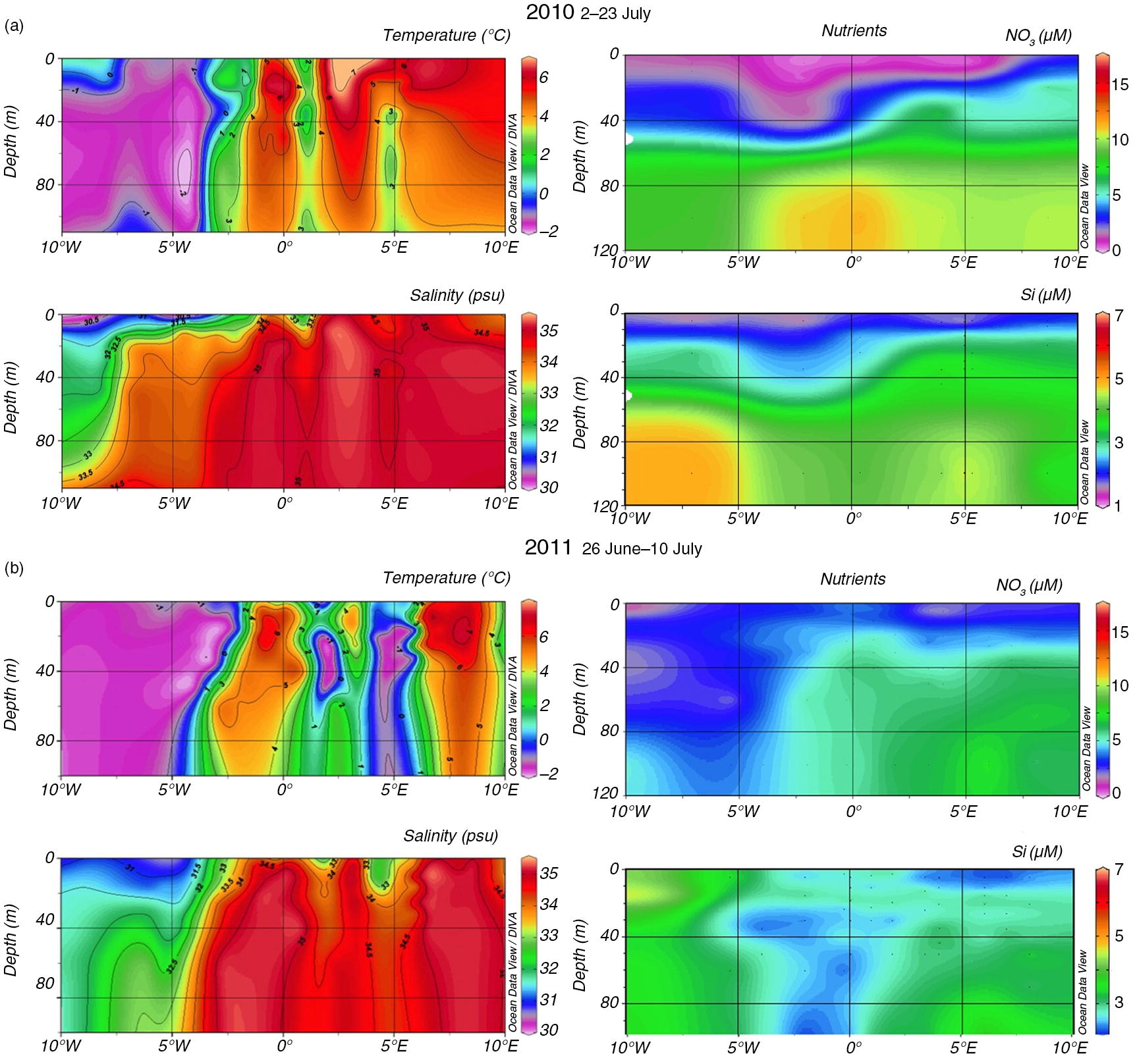 Fig. 5 (a) Section across Fram Strait, with the RV Polarstern, showing temperature, salinity and nutrients—nitrate (NO3 µM), silicate (Si µM)—(a) on the ARK XXV/2 cruise during 2–23 July 2010 and (b) on the ARK XXVI/1 cruise during 26 June–10 July 2011. (Figure generated with Ocean Data view, R. Schlitzer, www.odv.awi.de, 2015. For more details see Supplementary Fig. S3.)