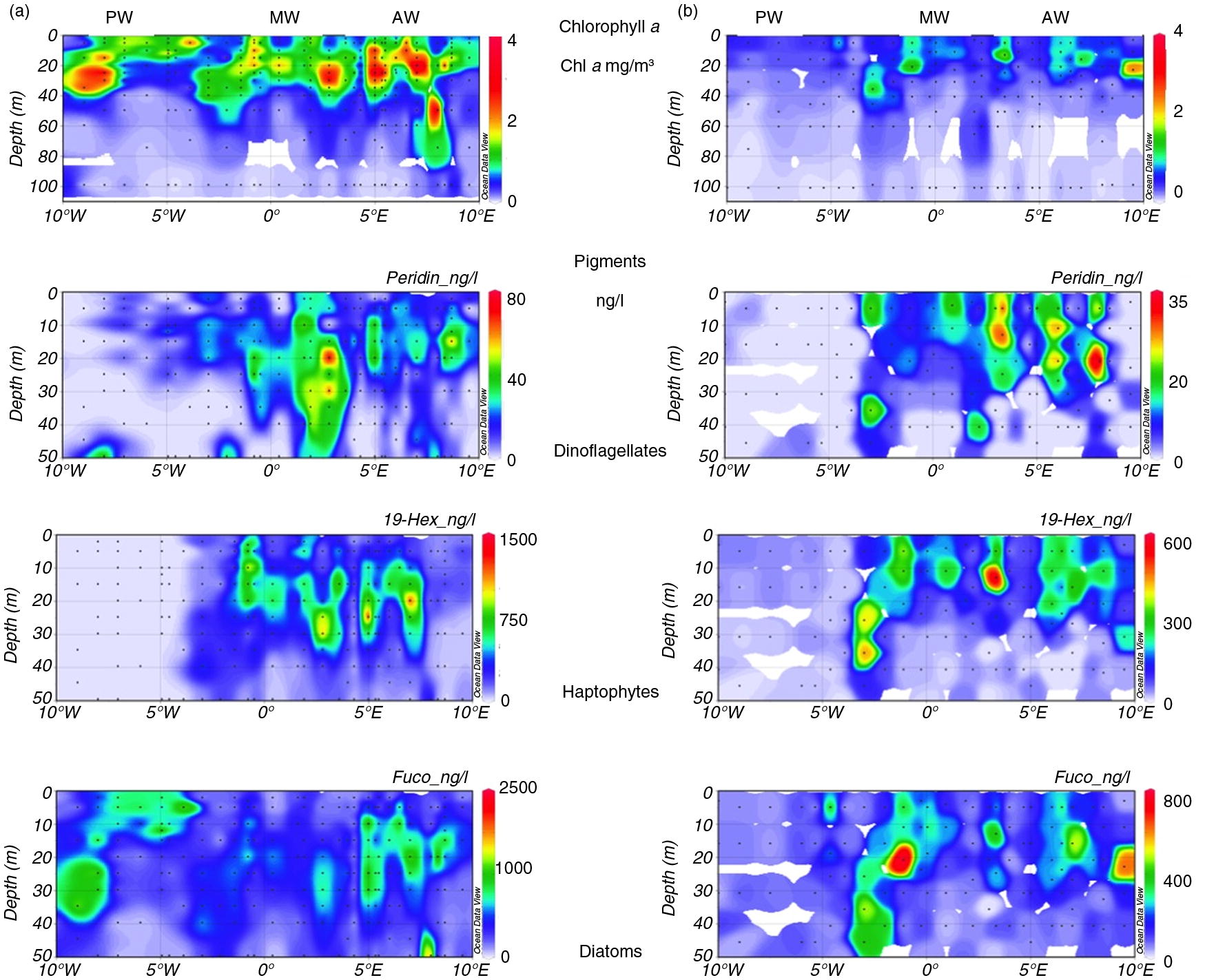 Fig. 6 Contour plots of the section at ca. 79° N for the sampling periods in (a) 2010 and (b) 2011 based on high-performance liquid chromatography data. Depicted are 100 m for chlorophyll a mg/m−3 and 50 m for the following marker pigments: peridinin for dinoflagellates, 19-hexanoyloxyfucoxanthn (19-hex) for haptophytes and fucoxanthin for diatoms, all in nanogram per litre. Note changing concentrations of the marker pigments: higher concentrations of all marker pigments were observed in 2010. The three main water masses indicated are cold Polar Water (PW), mixed water (MW) and warm northern Atlantic Water (AW). (Figure generated with Ocean Data view, R. Schlitzer, www.odv.awi.de, 2015.)