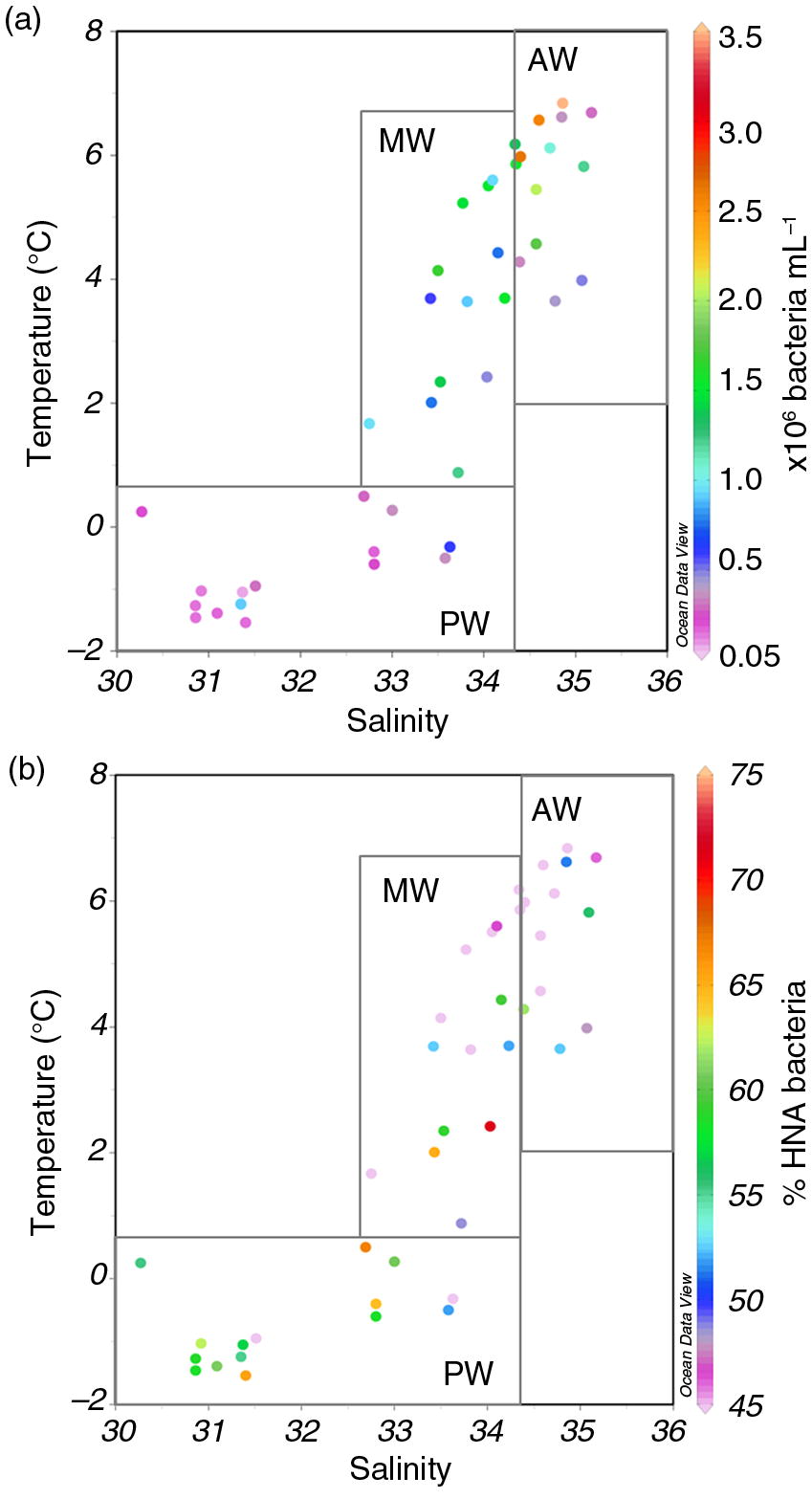 Fig. 7 (a) Total bacterial abundance and (b) the percentage of high nucleic acid (HNA) cells in surface samples at 79° N collected in summer 2010 and 2011. The three main water masses indicated are cold Polar Water (PW), mixed water (MW) and warm northern Atlantic Water (AW).