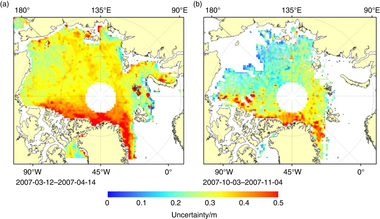 Spatial distribution maps of estimated uncertainty for sea-ice thickness for the (a) 07FM and (b) 07ON campaign.