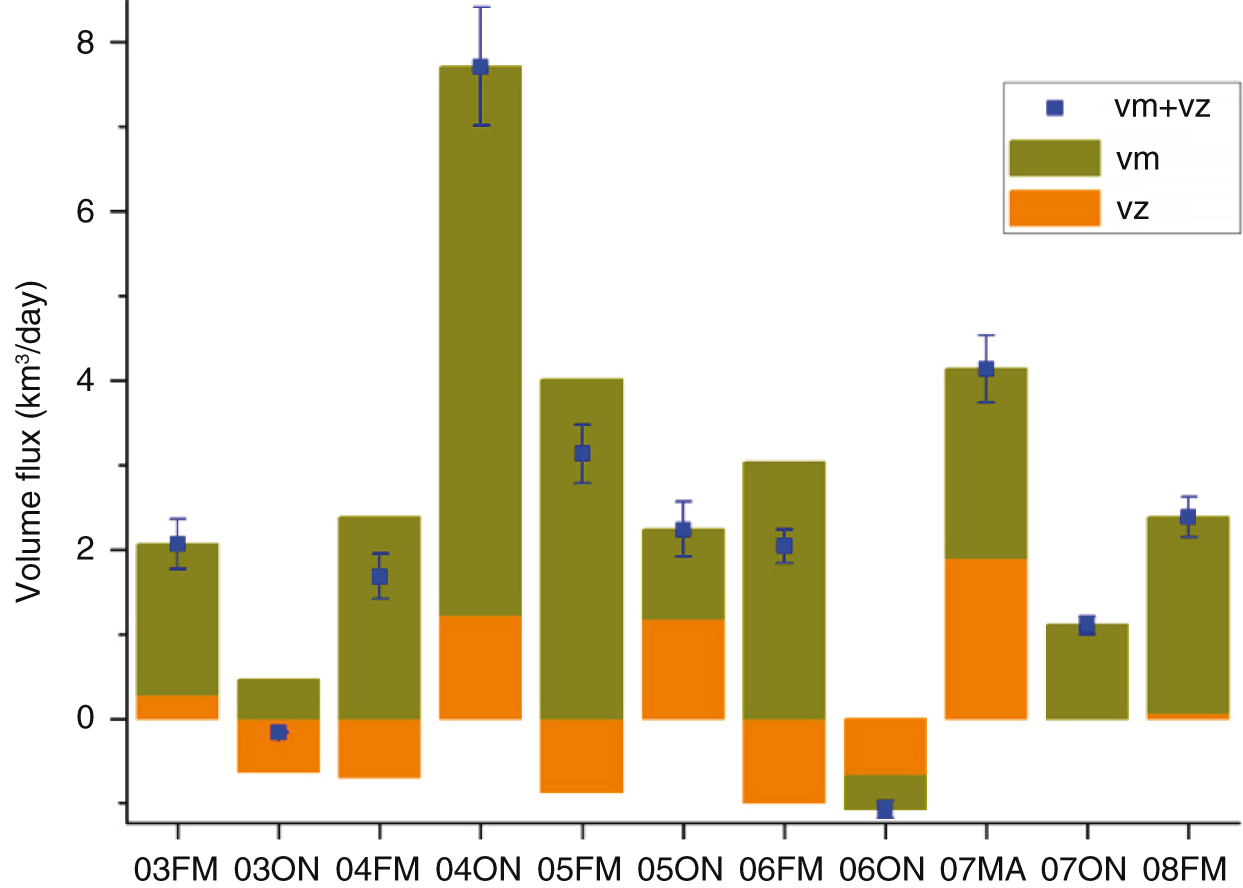 The variability of volume flux is also remarkable over the investigated ICESat periods (Fig. 6). It varies between 1.68 km3/day (04FM) and 4.13 km3/day (07FM) over the winter record and between −1.08 km3/day (06ON) and 7.71 km3/day (04ON) over the autumn record. For the NB, volume flux alternates between −0.39 km3/day (06ON) and 6.49 km3/day (04ON) over the autumn record, and between 1.78 km3/day (03FM) and 4.01 km3/day (05FM) for the winter record. For EB, it changed from −0.068 km3/day (06ON) to 1.21 km3/day (04ON) over the autumn record and from −0.99 km3/day (06FM) to 1.89 km3/day (07FM) over the winter record.
