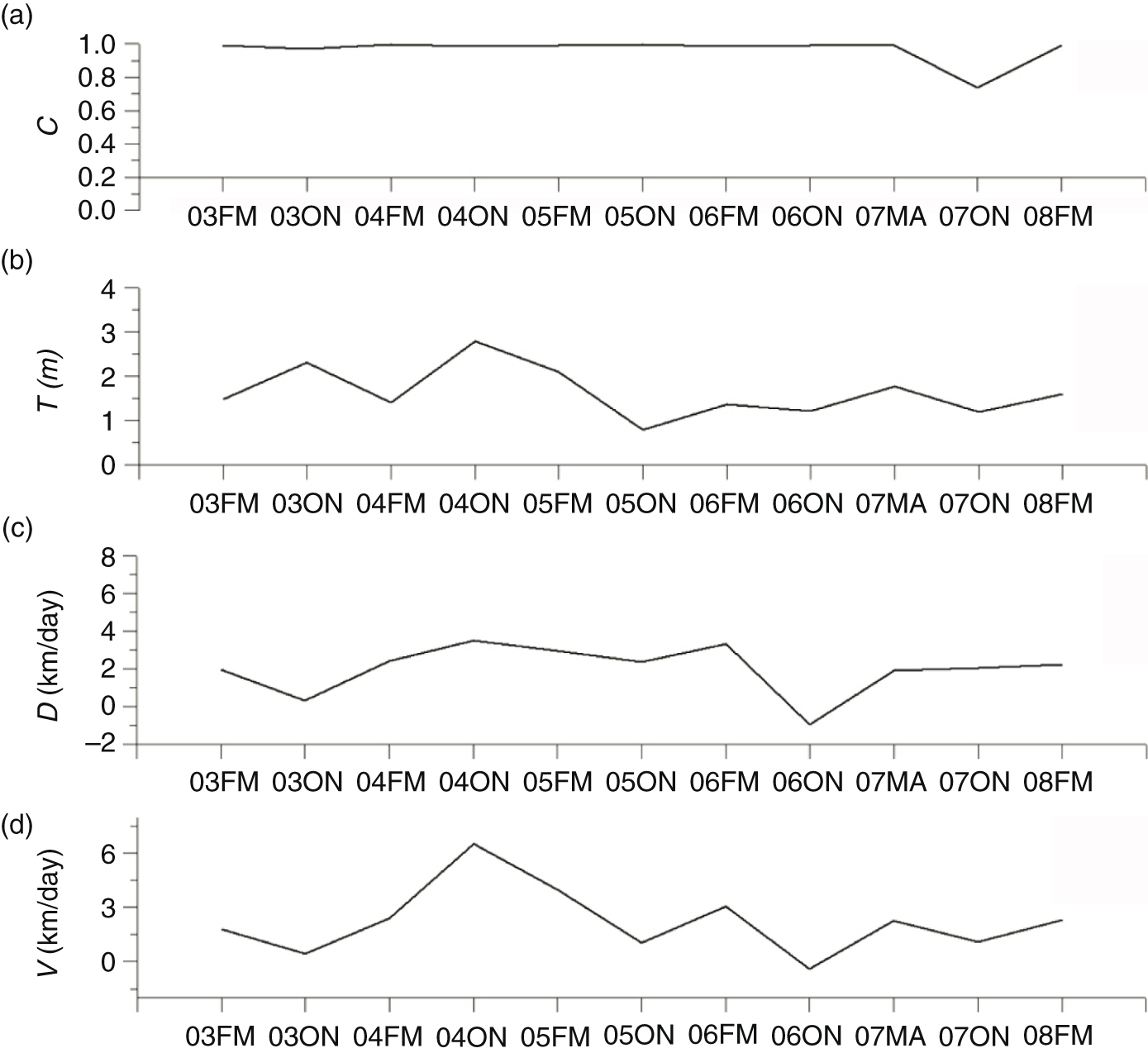Time series of volume flux estimates at the NB along with a time series of values of parameters used to obtain the volume flux estimates. This figure represents the variability of sea-ice concentration (c), ice thickness (T), ice-drift rate (D) and ice volume flux (V) over the NB boundary.