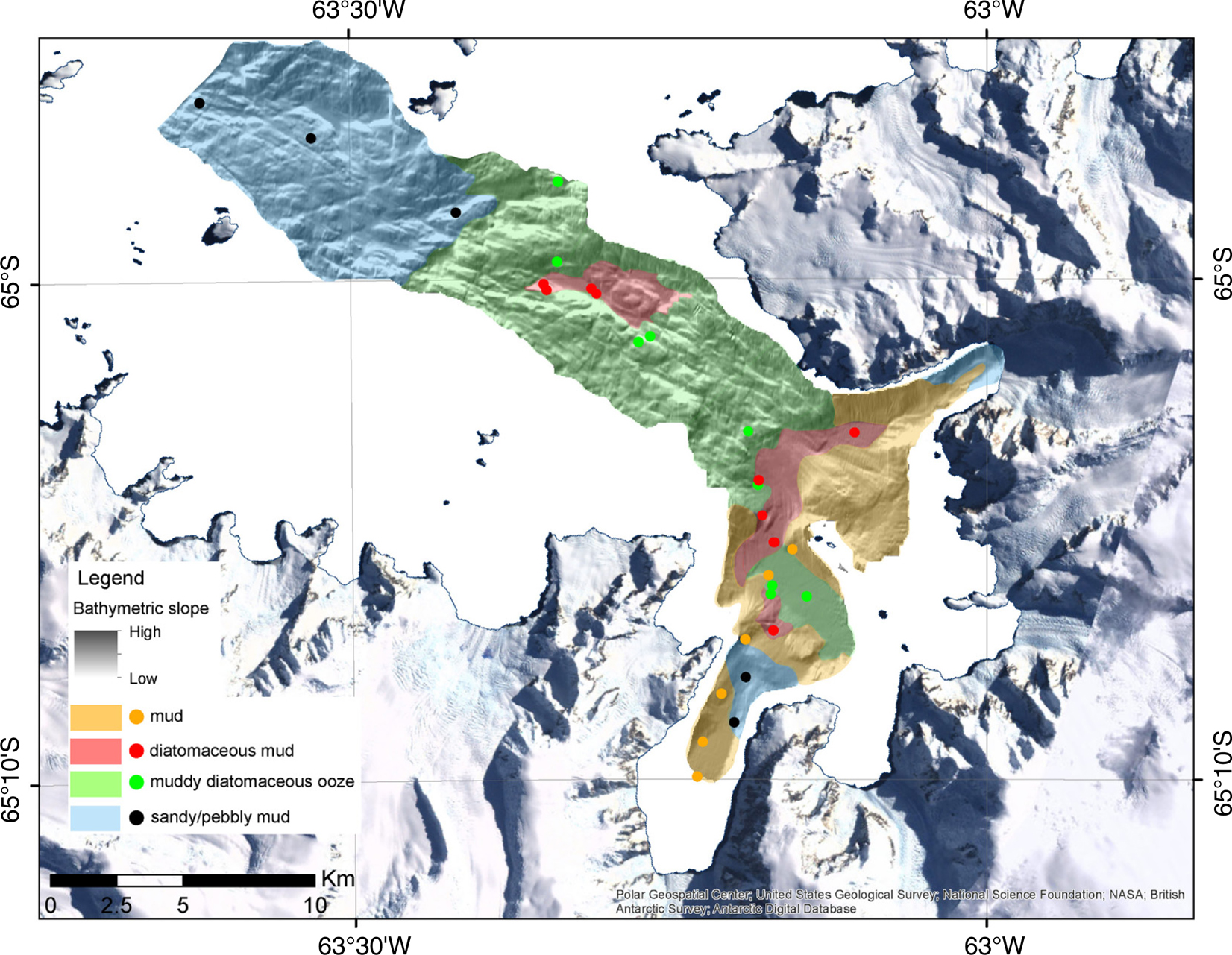 Muddy diatomaceous ooze was found in the northern outer bay (towards the Gerlache Strait) and in the middle of the bay. Diatomaceous mud covers the basins in the inner and outer bay. Sandy/pebbly mud was found in samples in the outer bay (in Bismarck Strait) and in the distal part of Etienne Fjord (inner bay). Mud was only found in samples collected in the central and distal regions of Etienne Fjord (Figs. 2, 6, 7).