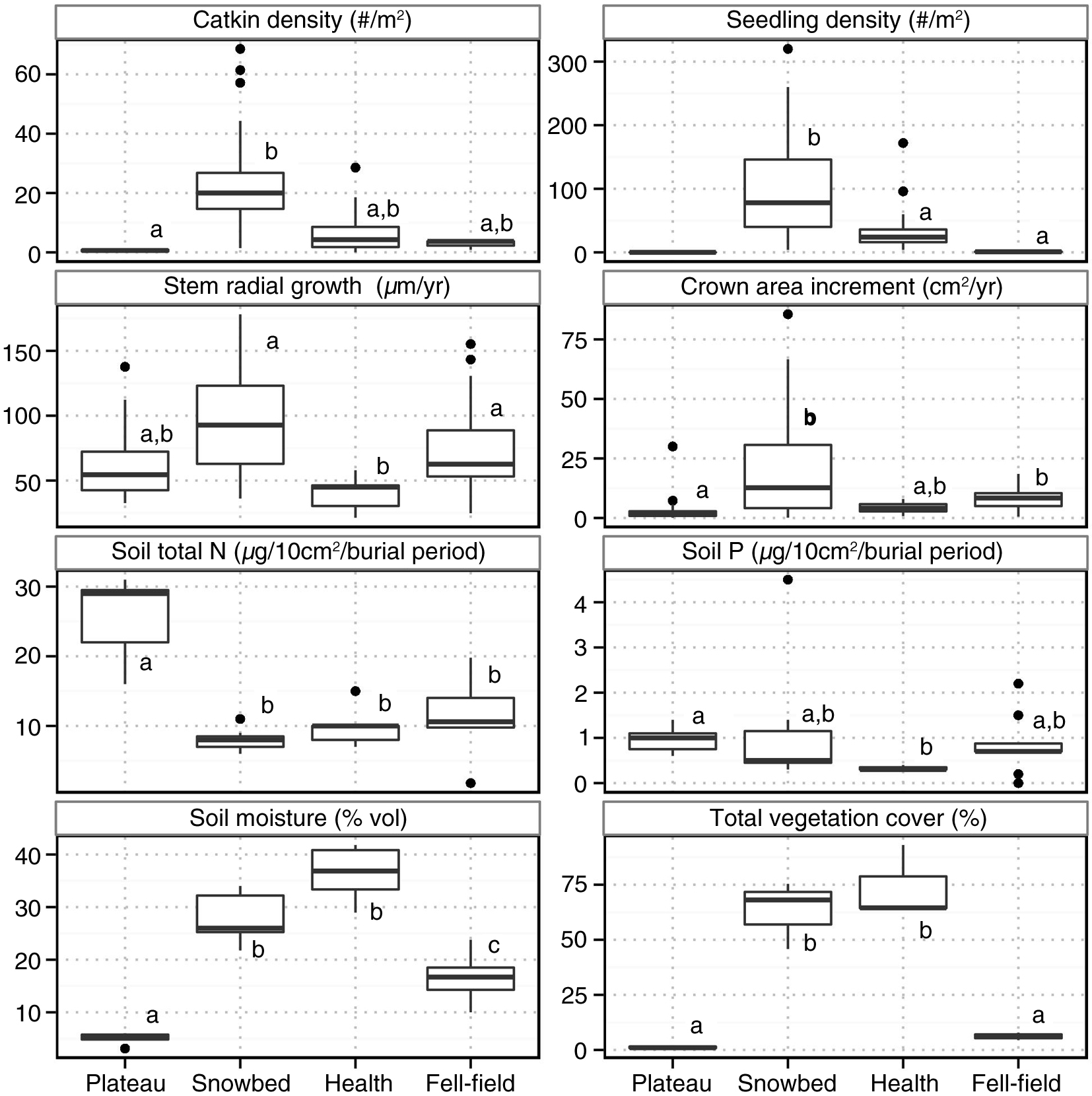 Total catkin density (#/m2), seedling density (#/m2), stem radial growth (µm/year), crown area increment (cm2/year), soil moisture (% vol), soil total N and P (µg/10 cm2/burial period) and total vegetation cover in four plant communities at Zackenberg, Greenland. Different letters indicate significant differences between sites (MCTAKW, P<0.05; Tukey HSD, P<0.05). Sampling size varies per variable and plant community measured, for catkins and seedling density: P: n=3, S: n=30, H: n=30, F: n=3; stem radial growth: P: n=18, S: n=19, H: n=13, F: n=31; crown area increment: P: n=21, S: n=20, H: n=12, F: n=22; Soil N and P: P, S and H: n=7, F: n=10; soil moisture: n=28/plant community; total vegetation cover: n=3/plant community.