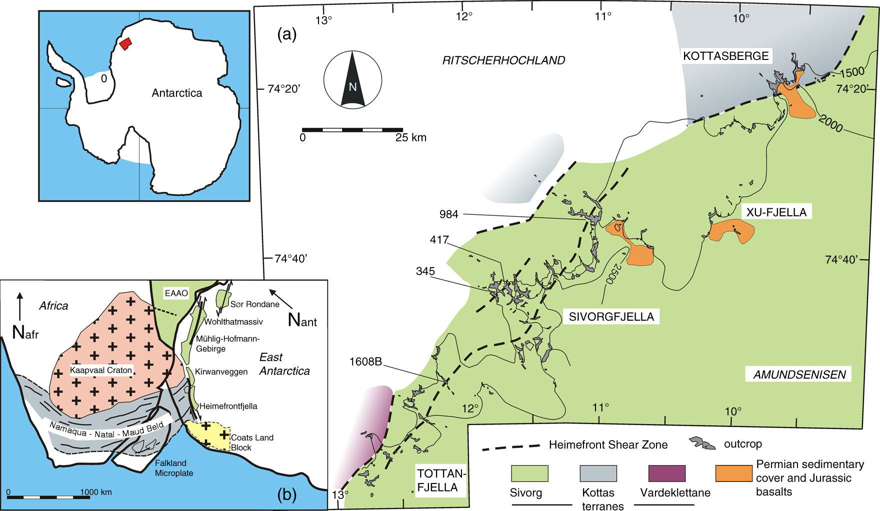 (a) Geological overview of the Heimefrontfjella and (b) its position in a Gondwana reconstruction (after Jacobs & Thomas 1994).