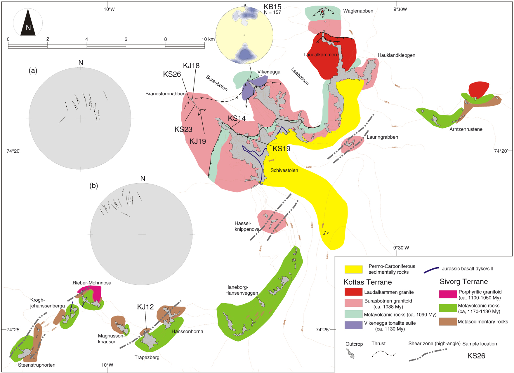 Geological map of the Kottasberge with sample locations. (a) Stereographic projection of the thrust zones in the Kottas Terrane with the trajectories of the stretching lineations (Hoeppener diagram). (b) Stereographic projection of high-angle shear zones in the south-western nunataks and the trajectories of the stretching lineations. At the top of Vikenegga a quartz c-axis diagram of sample KB15, 157 axes, contours at 1, 2, 3, … %.