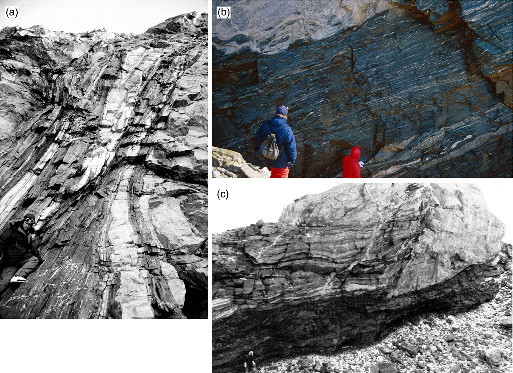 The south-western part of the Kottasberge is a chain of nunataks made up of a sequence of garnet–sillimanite–biotite paragneisses and bimodal metavolcanic rocks. Another chain of nunataks east of the main mountain massif (Arntzenrustene) is also characterized by metasedimentary rocks including calc-silicates and bimodal metavolcanic rocks. These areas are characterized by intense deformation with small-scale schlingen structures and metre-wide subvertical shear zones (Fig. 3a).