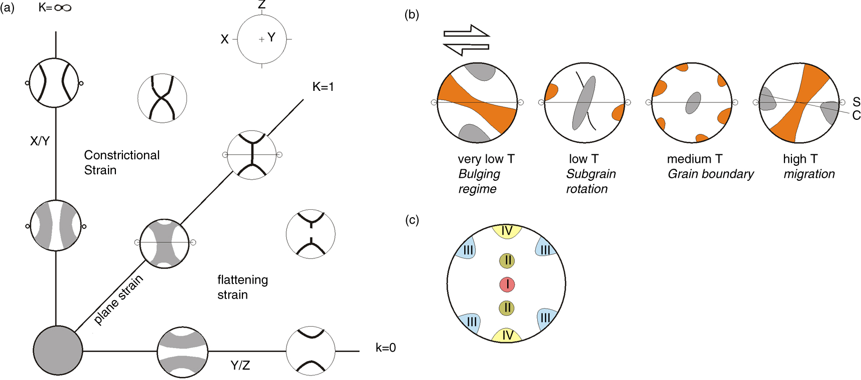 Pole diagrams showing quartz c-axes/quartz (001) reflection patterns produced by (a) pure shear (Flinn diagram) and (b) simple shear (Schmid & Casey 1986) with the prism a poles in orange; (c) positions different types of quartz c-axis maxima, modified from Sander (1950).
