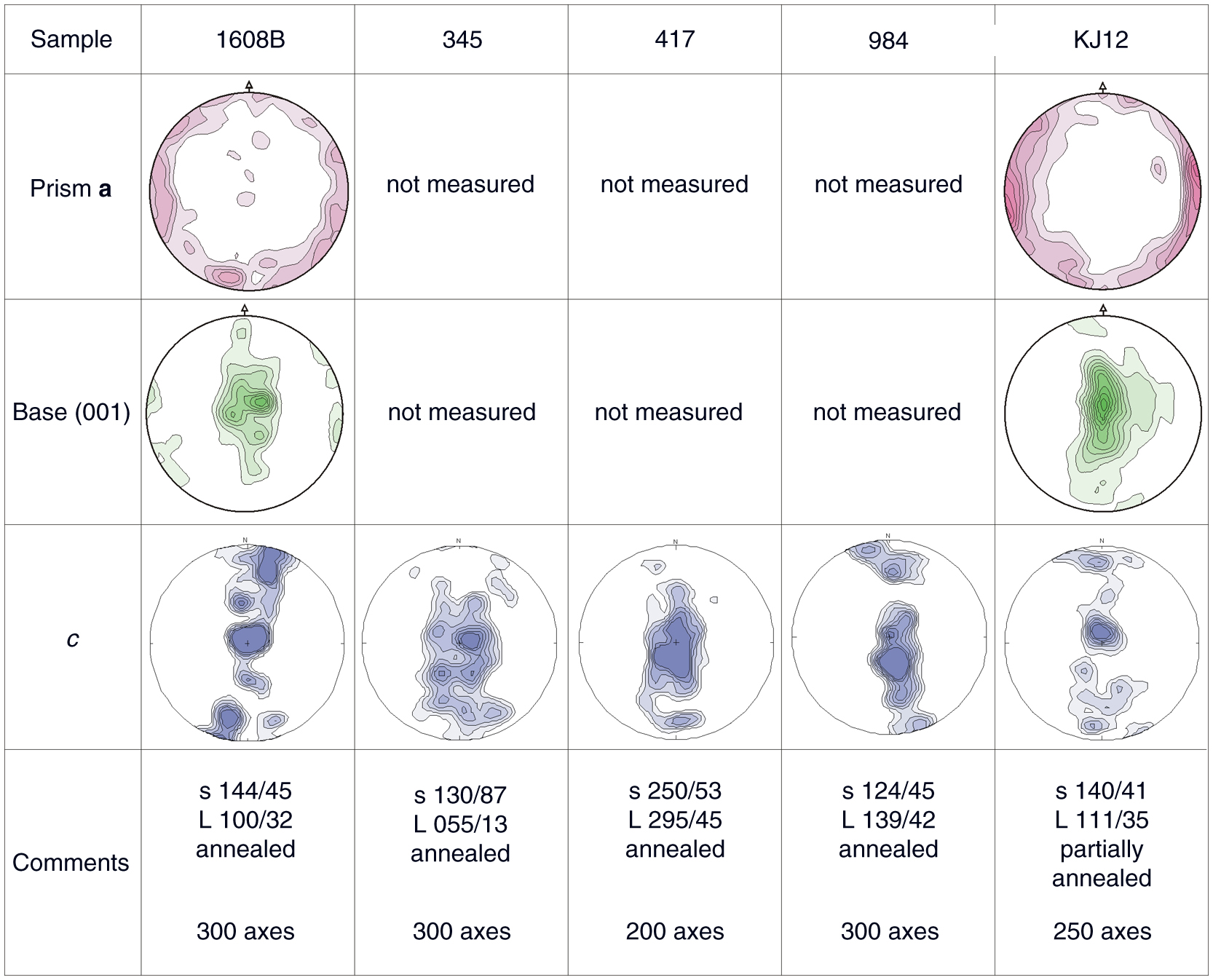 For nine samples, quartz textures were also determined using a Siemens x-ray texture goniometer at the Institute for Mineralogy and Economic Geology of the RWTH Aachen, using oriented circular specimens 20 mm in diameter and 5 mm thick. Quartz is the main component of all analysed samples but plagioclase, K-feldspar and biotite are also present, which restricts the application of x-ray texture goniometry. To avoid possible overlap with plagioclase, only pole figures of quartz bipyramids {112} and prism planes {110}, which do not coincide with reflections from plagioclase planes, were measured. Measurement conditions are given in the Supplementary Tables S1 and S2. Pole figures not presented in this study are described by Bauer (1995).