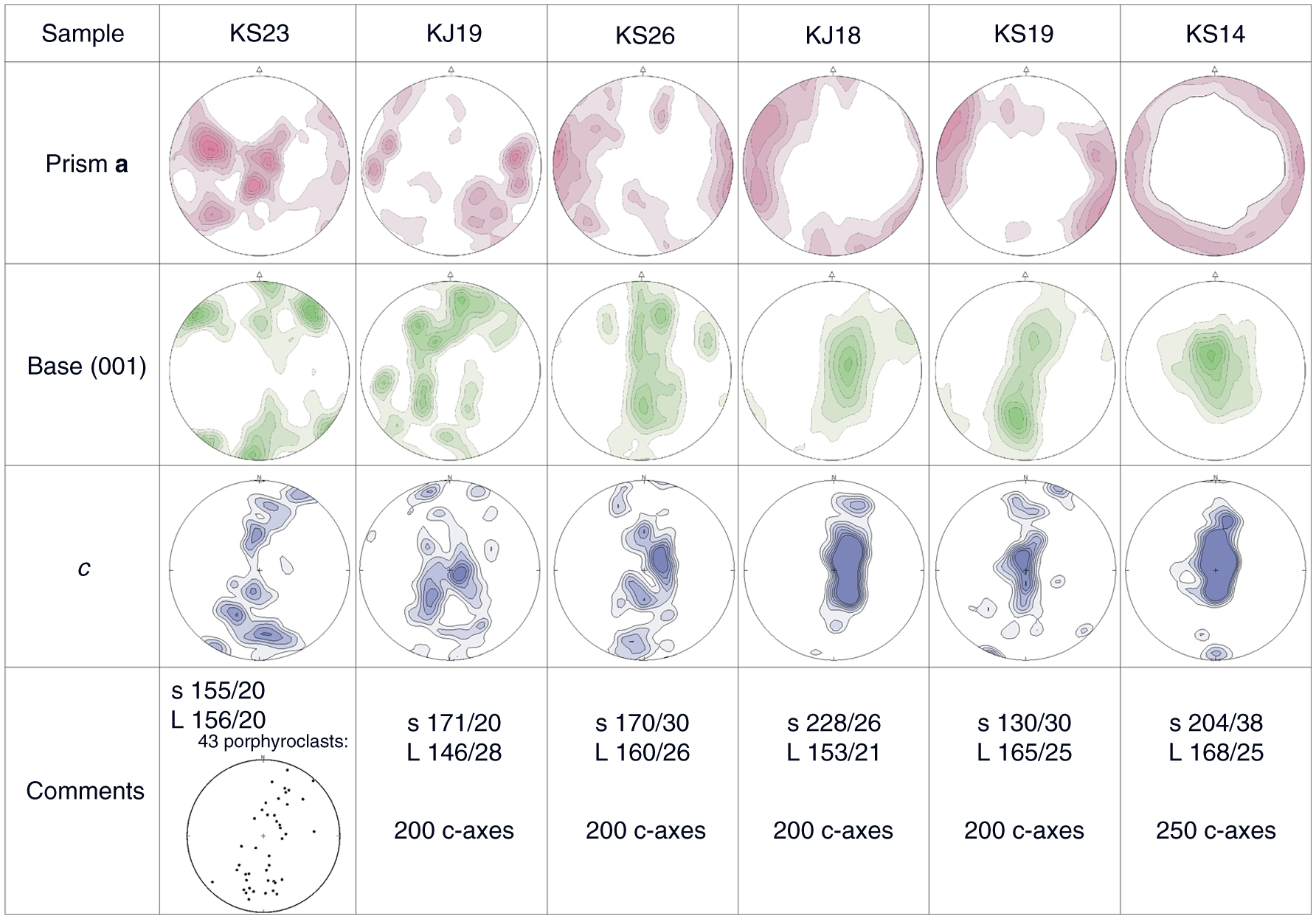 The quartz c-axis orientations were measured optically with a conventional U-stage microscope using oriented thin sections. All measurements are displayed in equal area, lower hemisphere projection. The Gaussian method with a kurtosis=100 was chosen as counting model. The bell-shaped weighting curve has a width at half-height of 8.1°. The resulting contours are equivalent to the conventional counting of 1% fixed circles but with a smoother outline.