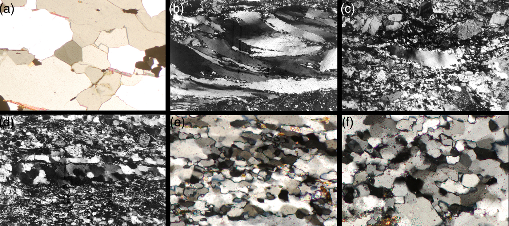 Microphotographs in the XZ plane of the finite strain ellipsoid, crossed polars: (a) orthoquartzite 1608B from the HSZ, grains annealed (width of the field of view 1.84 mm); (b) protomylonitic augen gneiss from Leabotnen showing elongated quartz crystals with numerous subgrain boundaries and beginning recrystallization along the grain margins (width of field of view 1.3 mm, polarizer and analyser both rotated by ca. 45°); (c) protomylonitic augen gneiss KS23, Brandstorpnabben, quartz with core and mantle structure (width of field of view 3.2 mm); (d) orthomylonite KS19 from Buråsbotnen with ribbon quartz (width of field of view 1.3 mm); (e) ultramylonite KJ18, centre of the Brandstorpnabben thrust, polygonal recrystallized grains with few larger porphyroclasts (width of field of view 0.46 mm); (f) ultramylonite KS14, centre of the Buråsbotnen thrust, polygonal pattern of recrystallized grains (width of field of view 0.46 mm).