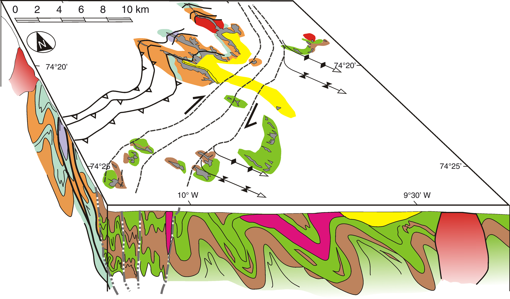 To accommodate these observations, we suggest that the HSZ developed under a transpressive, weakly dextral tectonic regime. North-west of the anticlockwise bend in the HSZ and about 3–4 km from its western margin a set of north–north-west directed thrusts form a positive flower structure (Fig. 8). In contrast, on the eastern side of the HSZ, for example at Arntzenrustene, gently south-east plunging, open folds prevail. The HSZ was active as a transpressive shear zone in Ediacaran/Cambrian times when the East Antarctic Craton collided with the Kalahari Craton in southern Africa. Kinematics and rheology of a transpressive shear zone in relation to plate motion and strain have been discussed by Tikoff & Teyssier (1994). Once activated, a transpressive, subvertical shear zone predominantly accommodates the strike-slip component during an oblique plate collision. To accommodate the simple shear component, strain partitioning is leading to the formation of low-angle thrusts with a strike parallel to the subvertical shear zone (Tikoff & Teyssier 1994). In the Heimefrontfjella, these thrusts are exposed in the northern part, where they form meter thick mylonitic shear zones. For a full analysis of the kinematics of the HSZ it would be necessary to study the eastern margin of the orogeny. The plate which collided with the Kalahari Craton is, however, completely covered by the ice of East Antarctica and the central part of the East African/Antarctic Orogen contains cratonic blocks which are poorly studied and with an unknown plate motion (Jacobs et al. 2015).
