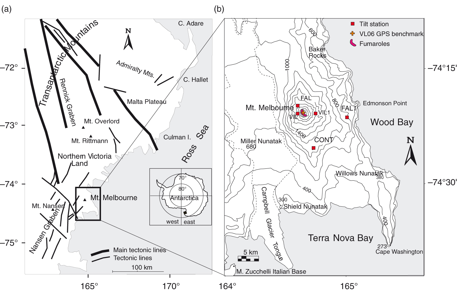 Tectonic sketch map of (a) northern Victoria Land (redrawn from Carmignani et al. 1989). (b) Map of the permanent tilt network on Mount Melbourne.