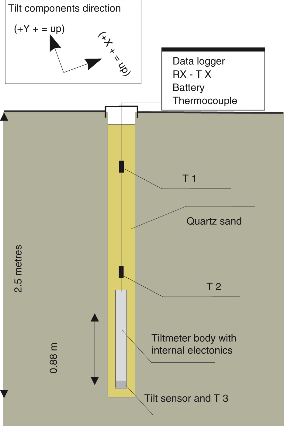 In early 1989, five continuous recording sensors (Figs. 1b, 2; Supplementary Fig. S1) consisting of biaxial borehole bubble sensors were installed at a depth of about 2.5 m (Bonaccorso et al. 1995). The tilt sensors have a 0.1 microradian resolution (Applied Geomechanics Model 722) and two components trend radially (Tilt X) and tangentially (Tilt Y) with respect to the Mount Melbourne summit. In particular, increases in the radial component indicate inflation of the crater area, while positive variations of the tangential component indicate inflation at 90° counter-clockwise with respect the radial component. The boreholes also have two thermocouples (T1, T2) (copper–constantan type, 0.1°C precision) shaft (mean depths 1.0 and 1.9 m, respectively) and a tilt temperature sensor at the ends of the instrument that records the permafrost temperature. The control data-logger was programmed for 48 data/day sampling (one sample every 30 min) and includes acquisition of the two tilt components, air (Tbox) and ground temperatures and instrumental control parameters, such as battery and DC/DC voltage. Each station is equipped with solid state memories which guarantee data acquisition through the winter months, while high capacity batteries power the station.