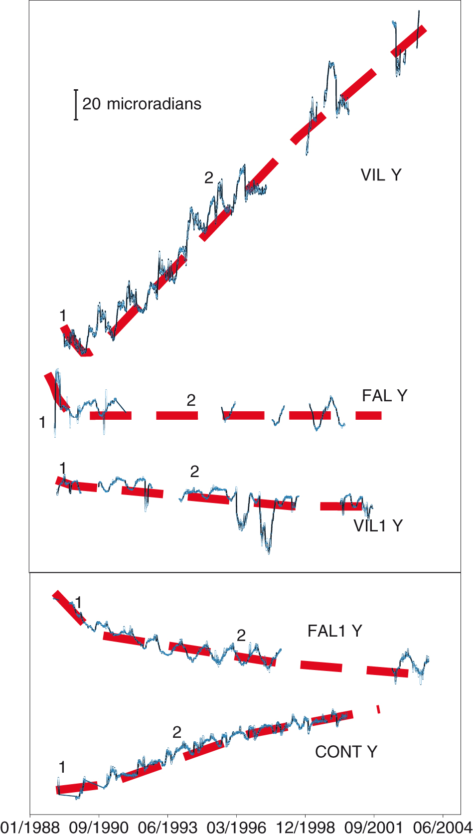 Long-term trends recorded in tilt data comprise real ground deformation, the local site dynamic and instrumental drift (e.g., Kohl & Levine 1993; Anderson et al. 2010). The secular marked trends visible at VIL and to a lesser degree at CONT (Figs. 5, 6, phase 2) stations may be linked to instrumental drifts.