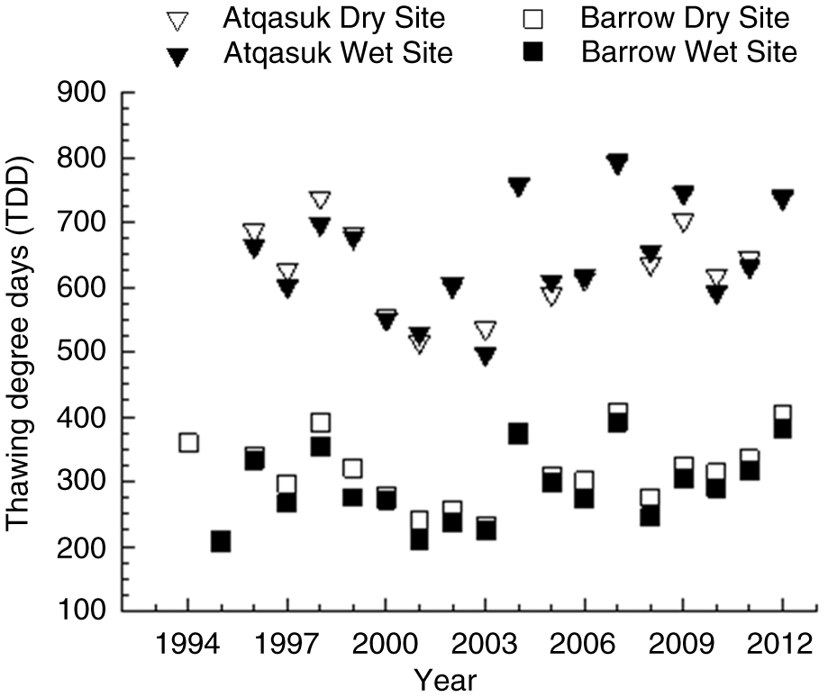Temperatures over time at the four study sites. Symbols represent average thawing degree days totals (TDD) for the summer at a given site in a given year. The sample size was the number of years of the experiment (19 at Barrow dry, 18 at Barrow wet and 17 at both Atqasuk sites).