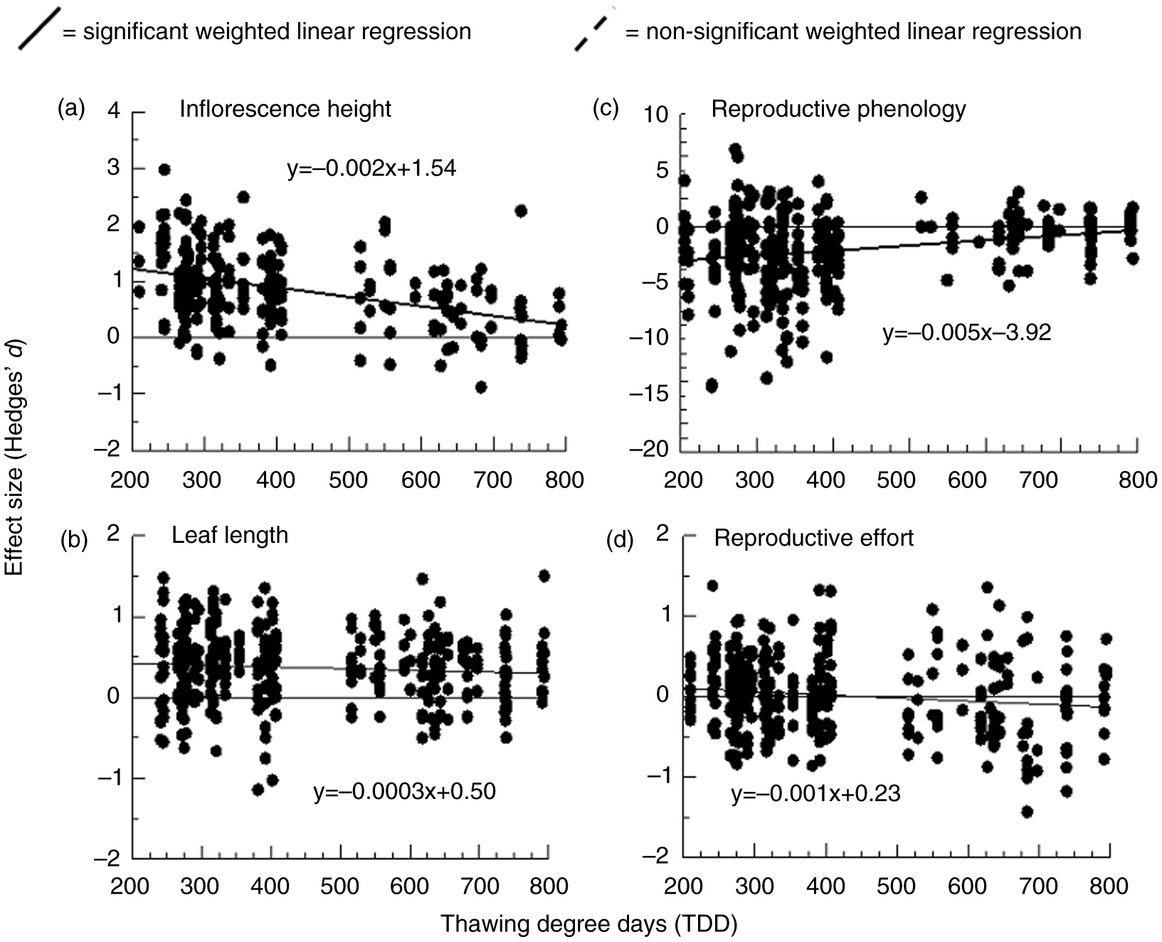 where ne and nc are the sample sizes of the control and warmed plants, respectively. This method treated each species, trait and year as an individual study. The studies were then also pooled by site and growth form within a site. Performing analyses this way allowed us to directly compare our findings to those of similar studies (Arft et al. 1999; Rosenberg et al. 2000; Dormann & Woodin 2002). We performed two additional analyses; one to assess whether effect sizes of experimental warming were changing over time and another to discern if there was a relationship between effect sizes of experimental warming and summer temperature. Both analyses were performed using effect sizes calculated as Hedges’ d as described above, but here the average plant trait values for each study site and year were treated as an individual study (thus the sample size for each point was the number of species that occurred at the site). We then used weighted least-squares regressions to assess trends in effect sizes for each site over time and with respect to summer temperatures (TDD). Metawin version 2.1 was used for these analyses (Rosenberg et al. 2000). Effect sizes were considered significant when their 95% confidence interval did not overlap with an effect size of zero.