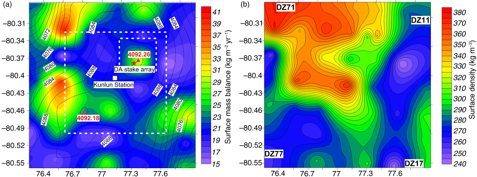 (a) Map of the mean (2008–2013) SMB across Dome Argus interpolated from stake observations. Black contours are surface elevations (WGS84 ellipsoid) with intervals of 2 m based on GPS data from 27th CHINARE. The small and large white dashed squares cover the 64 km2 and 400 km2 areas surveyed by Zhang et al. (2007) and Cheng et al. (2009), respectively. The solid white square represents Kunlun Station, the red star represents DA stake array and the red triangles represent the two summits of Dome Argus. (b) Map of surface density interpolated from observations.