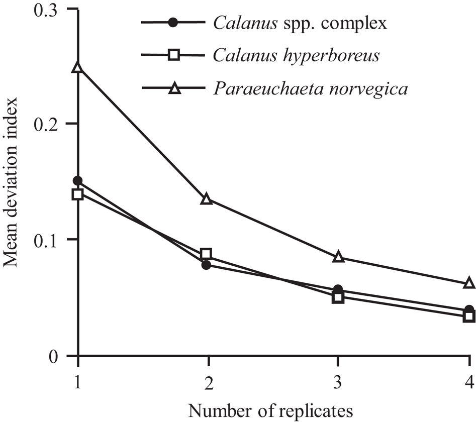 Using only one replicate to estimate seasonal stock abundance was clearly different from using five replicates, and the median DI decreased gradually with the number of replicates (Fig. 3). Stock estimate indices of the Calanus spp. complex and C. hyperboreus were similar even though their abundance, on average, differed by about one order of magnitude. Paraeuchaeta norvegica was less abundant, and its deviation indices differed more from the true stock abundance calculated by the five replicates.
