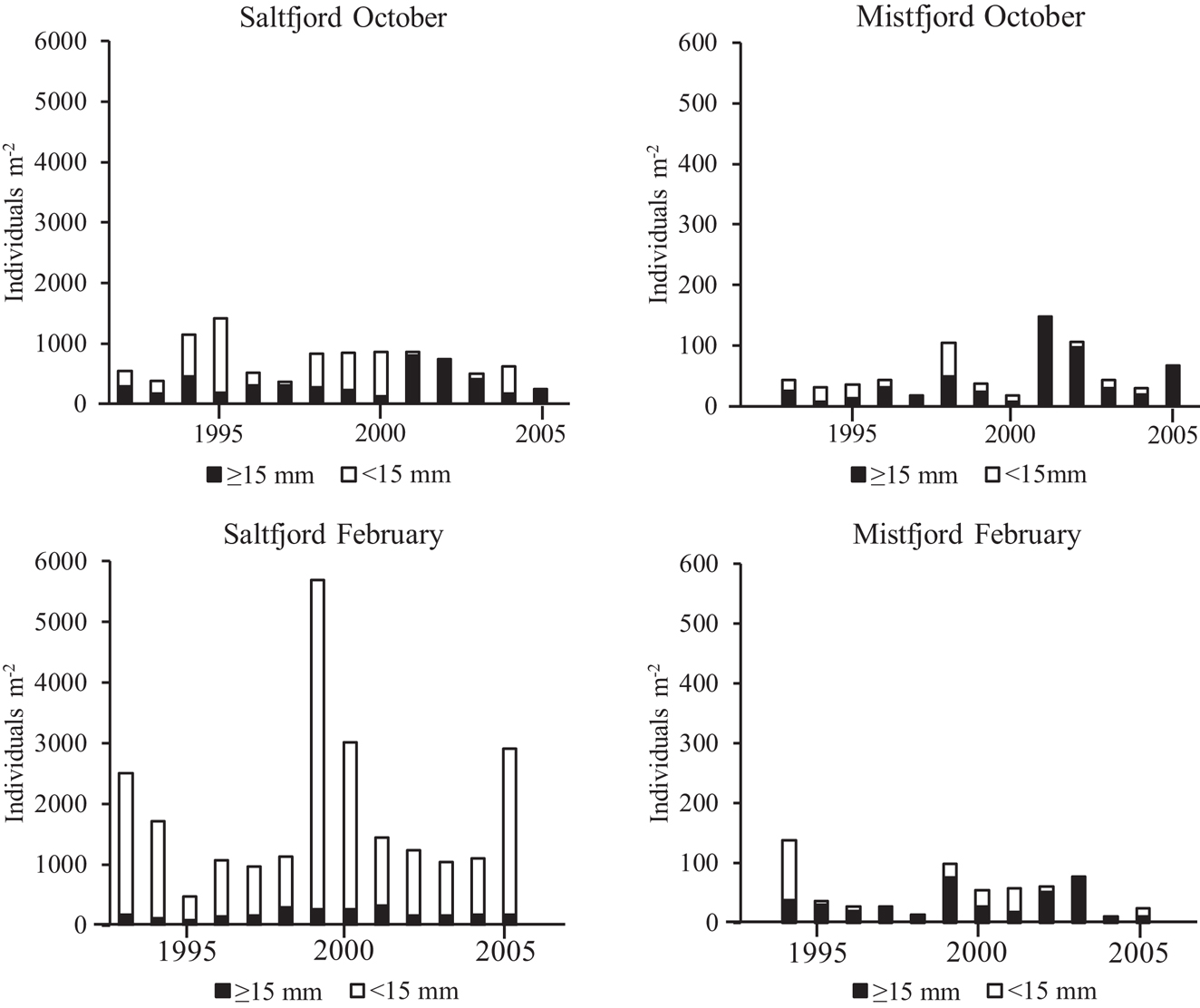 Stock abundance of the Calanus spp. complex in both fjords in October from 1983 to 2005 was, on average, higher than for other species (Table 1). The decrease in average stock abundance from October to February was the greatest in Saltfjord; here, the seasonal decrease varied from 28 to 94%. The decrease in Mistfjord varied less, from negligible to about 77%, which, on average, made Calanus spp. complex more abundant than in Saltfjord in February.