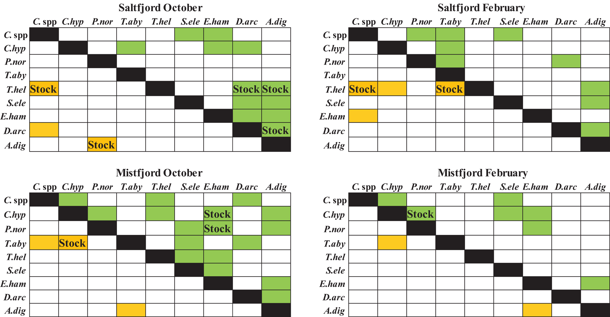 Fig. 5 Matrices for the interspecific relations in the abundance of zooplankton in Saltfjord and Mistfjord according to the statistics in Tables 2 and 3. White: not significant; green: positive in situ relation; yellow: negative in situ relation; stock: significant stock relationship included. Abbreviated taxa: C. spp: the Calanus spp. complex (C. finmarchicus, C. glacialis and C. helgolandicus); C. hyp: Calanus hyperboreus; P. nor: Paraeuchaeta norvegica; T. aby: Themisto abyssorum; T. hel: Tomopteris helgolandica; P. ele: Parasagitta elegans; E. ham: Eukrohnia hamata; D. arc: Dimophyes arctica; A. dig: Aglantha digitale