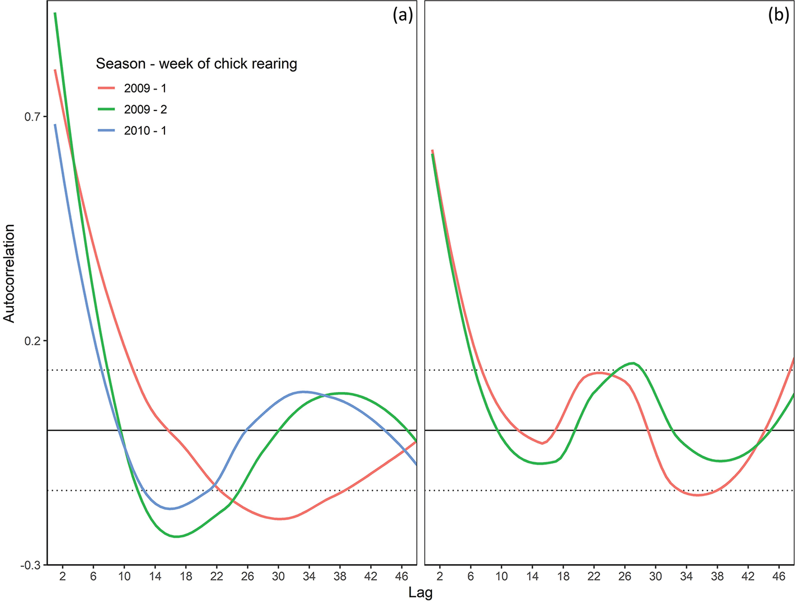 Fig. 4 Example correlograms of two individuals with contrasting patterns—(a) non-consistent and (b) consistent—recorded during the 48-hr observations, performed during two stages of the chick-rearing period and two breeding seasons.