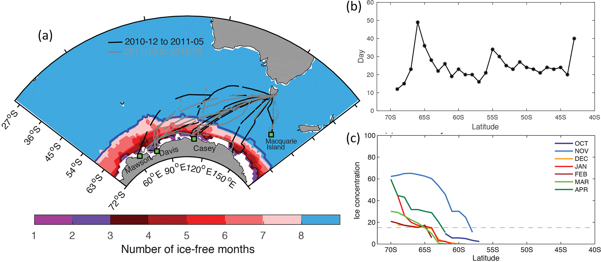 Fig. 1 (a) The ship routes between Hobart, Australia, and the Antarctic continent. The blue line denotes the equatorward edge of the MIZ. (b) Number of observations constructed from all available measurements along the ship’s tracks, and (c) monthly mean condition of the SIC with the 15% SIC denoted by the dashed black line.