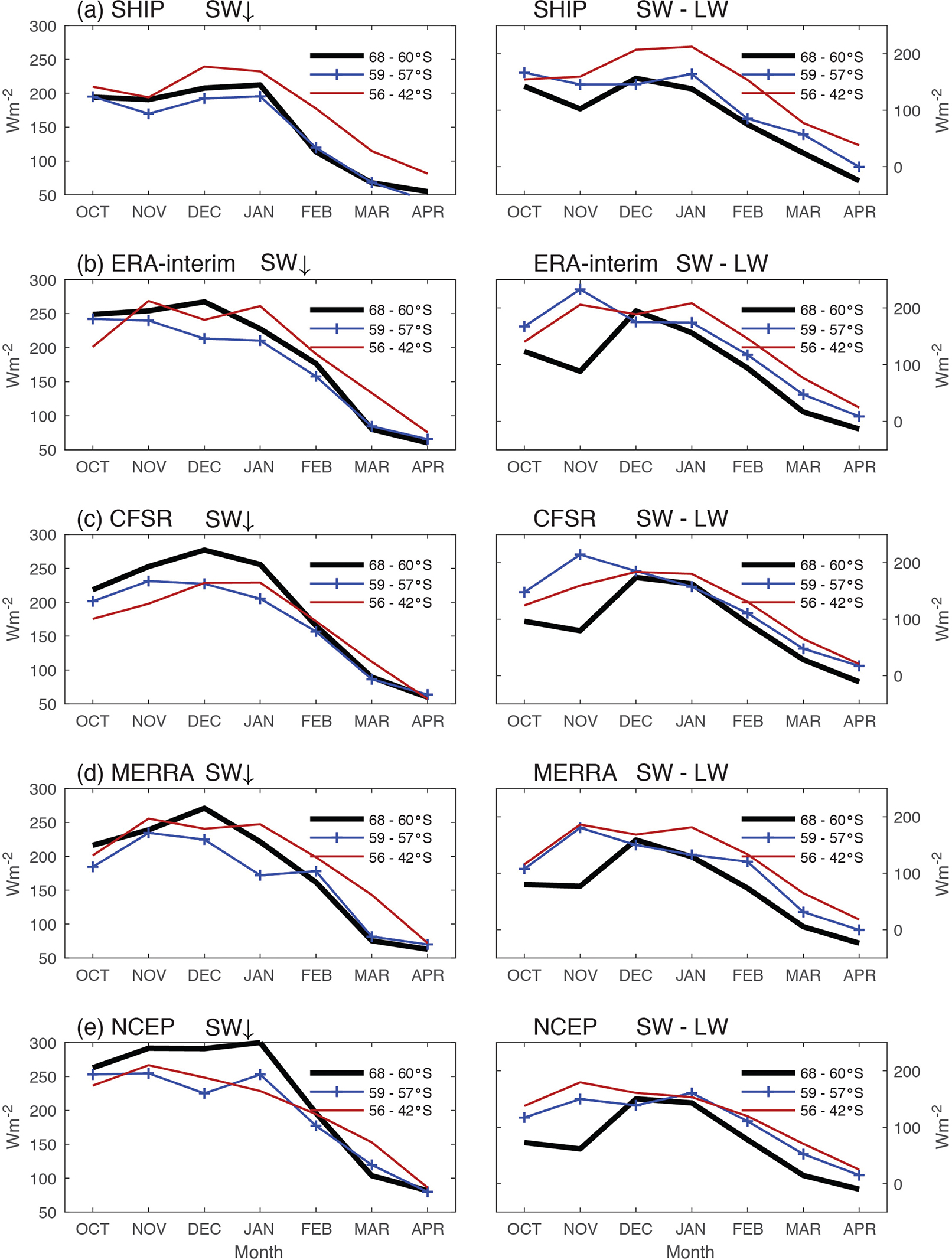 The observed net downward surface radiation SW–LW (the sum of all radiative components expressed as [SW↓– SW↑]–[LW↑–LW↓]) (Fig. 8) shows that the MIZ receives a slightly larger net downward radiation in December solstice when the number of hours of daylight is greatest. Except for CFSR, all the reanalyses do well in producing this feature. Interestingly, despite the large differences between ship measurements and reanalyses in depicting the relative strength of SW↓ between the MIZ (68–60°S) and the Subantarctic (56–42°S), all the reanalyses agree with ship values in showing that the Subantarctic receives more net downward radiation than the MIZ during all seven months. It seems that error compensation between various radiative components is a major problem in the reanalyses.