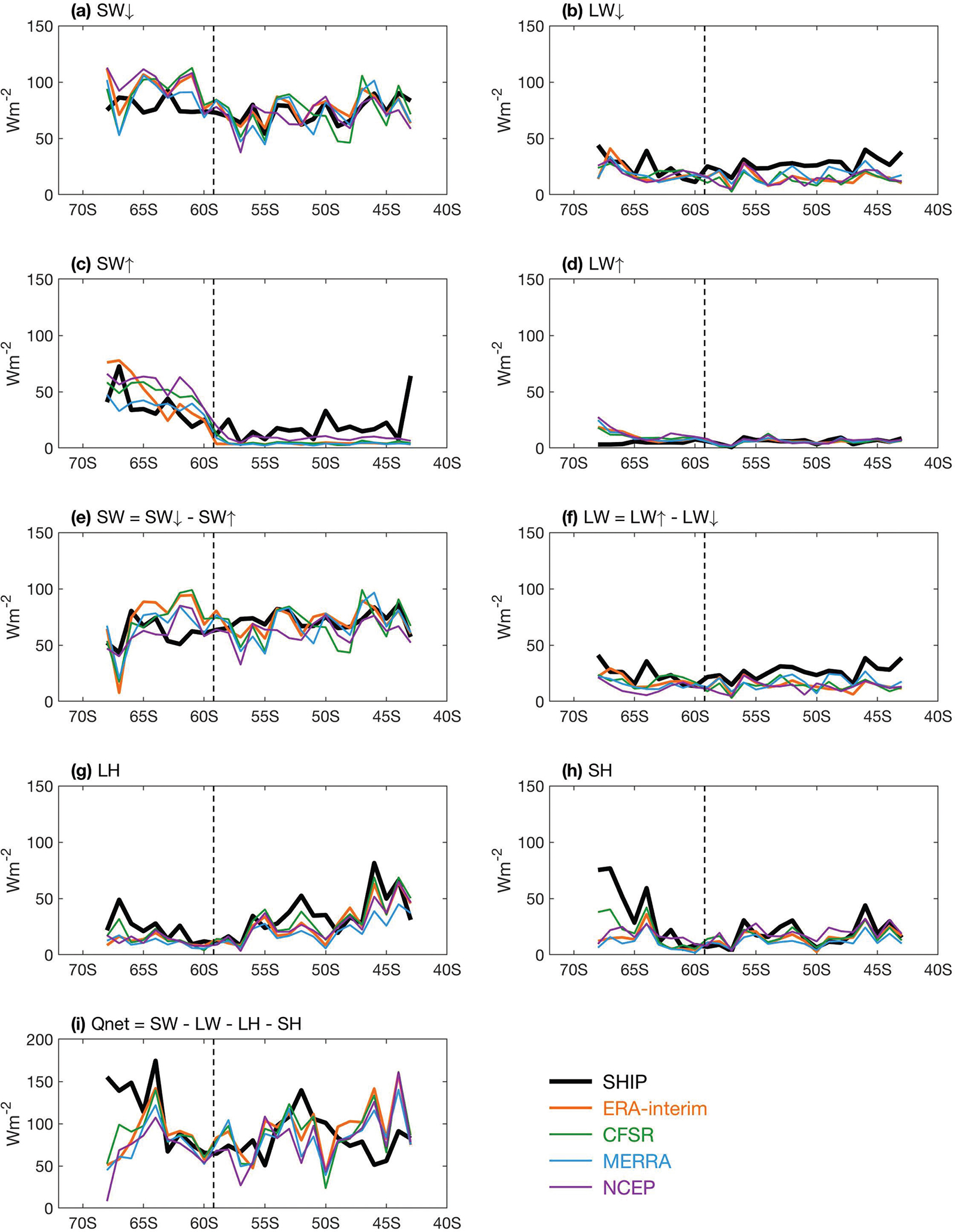 In summary, two biases stand out in the reanalyses: the excessive LW cooling across the MIZ and the Subantarctic open water and the weak heat loss by SH in the MIZ. CFSR shows a slightly better agreement with ship observations compared to the other three reanalyses, perhaps due to the inclusion of an interactive ice model. ERA-interim air–sea variables (near-surface air temperature and humidity, wind speed, etc.) in the MIZ have the best comparison with ship measurements, but this does not translate to a better comparison of the fluxes.