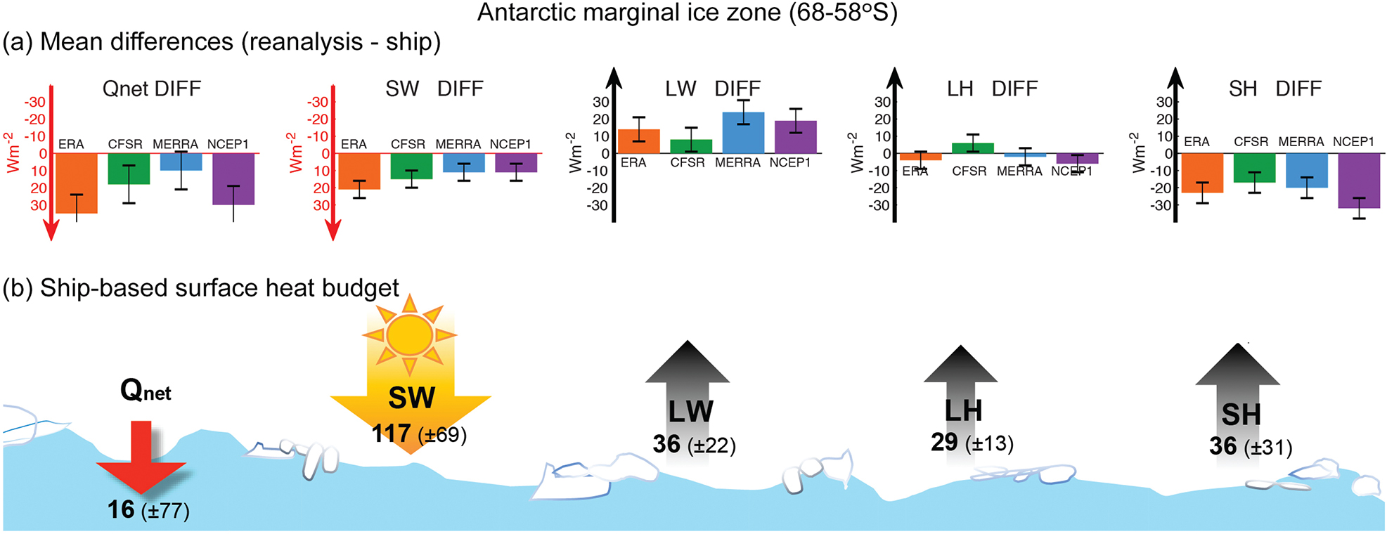 Fig. 12 (a) Left to right: bar plots of the mean difference between reanalysis (RA) and ship in Qnet, SW, LW, LH and SH averaged over the Southern Ocean. (b) Left to right: ship-based mean flux in Qnet, SW, LW, LH and SH in the MIZ. Error bars represent one SD for the measurement points used in constructing the mean. The x axis in (a) denotes the products, and the y axis denotes the mean difference, with the direction of the axis consistent with the direction of the mean flux defined in (b). Downward fluxes (warm coloured arrows) indicate oceanic heat gain and upward fluxes (black arrows) oceanic heat loss. Positive biases in Qnet and SW denote that downward net heat and net SW↓ into the ocean are overestimated (warm bias) and negative biases in Qnet and SW denote that downward-net heat and net SW↓ into the ocean are underestimated (cold bias).