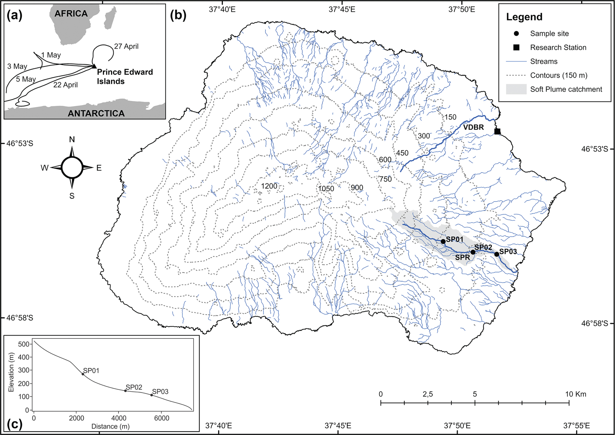 Higher temporal resolution investigations into stream water chemistry on the island are rare. Grobbelaar (1974) provided the only continuous, daily time series of stream water chemistry. Samples were taken from six locations along the VDBR (Fig. 1b) and also over a 27-day period (8 February – 5 March 1972) at a single site, approximately at 250 m a.m.s.l. The VDBR is a major stream situated on young black basaltic lava on the eastern side of the island, similar to that of the SPR (Fig. 1b). The VDBR has been dammed to provide the research station with water. This has altered stream flow dynamics below the dam, and the VDBR has been observed to run dry near the coast during prolonged dry spells (Hedding, pers. obs.). Grobbelaar (1974) showed that sea salts were the most abundant at all sites, with a small increase in ionic content along the course of the river. Temporal variation in stream Na+ and Cl− concentrations were observed through the time series. Strong negative correlations were found between the amount of daily rainfall and Na+ (r = −0.74) and Cl− (r = −0.54) in streams, suggesting that the amount of rainfall has a significant influence on stream chemistry (Grobbelaar 1974). However, precipitation on Subantarctic Marion Island has decreased significantly since the 1960s from an annual average of 2727 mm in the 1960s to 1778 mm in the decade preceding 2016 (Hedding & Greve 2018). To expand on this information, concentrations of major ions in the SPR on Subantarctic Marion Island were measured with greater frequency. Samples were collected daily over a 16-day period (21 April–6 May 2015) from three sites along the stream to better understand the temporal and spatial variability of stream water chemistry on the island. The purpose of the research is to evaluate the influence of sea spray and chemical weathering on stream water chemistry on Subantarctic Marion Island.