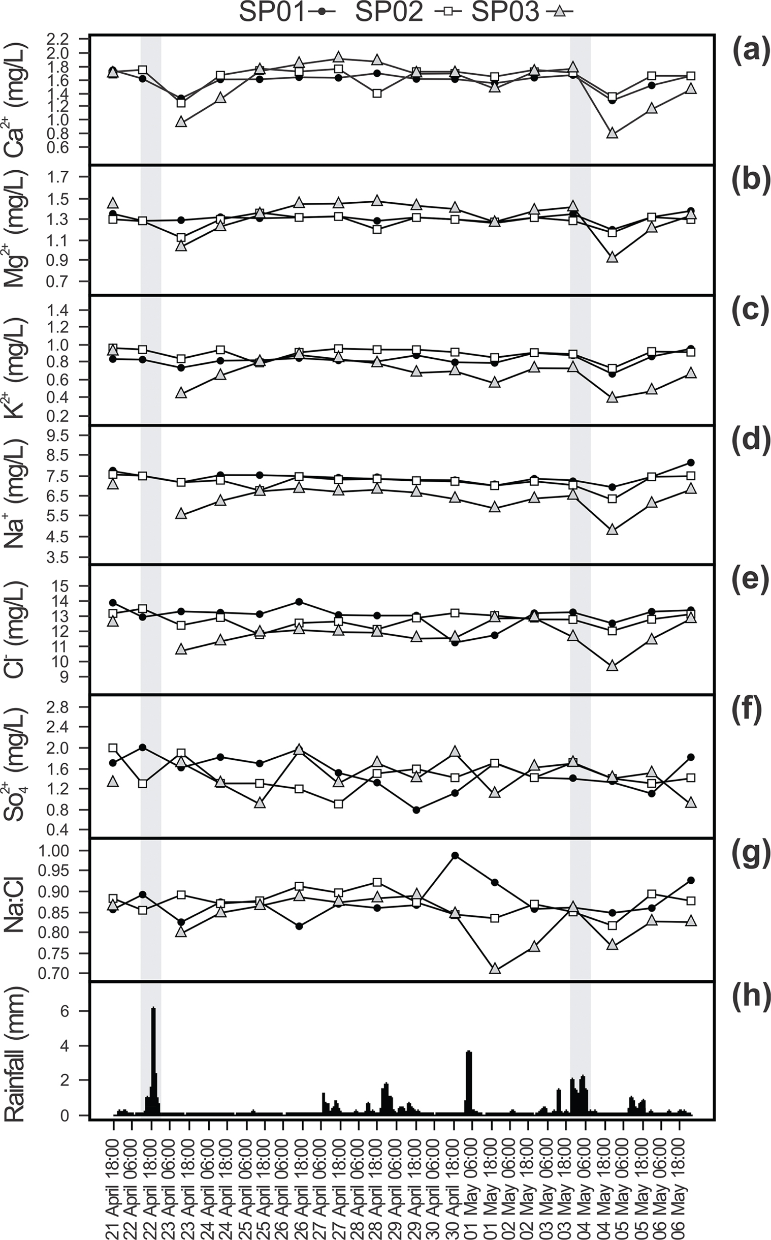 Fig. 2 Time series of (a) Ca2+, (b) Mg2+, (c) K+, (d) Na+, (e) Cl−, (f) SO42− and (g) Na:Cl ratio over the period 21 April –6 May 2015, measured at SP01, SP02 and SP03 along the SPR. Vertical grey bars indicate the duration of rainfall between 12:00 and 21:00 GMT + 3 on 22 April 2015 (14.4 mm) and 20:00 GMT +3 on 3 May 2015 to 04:00 GMT +3 on 4 May 2015 (11.8 mm), respectively.