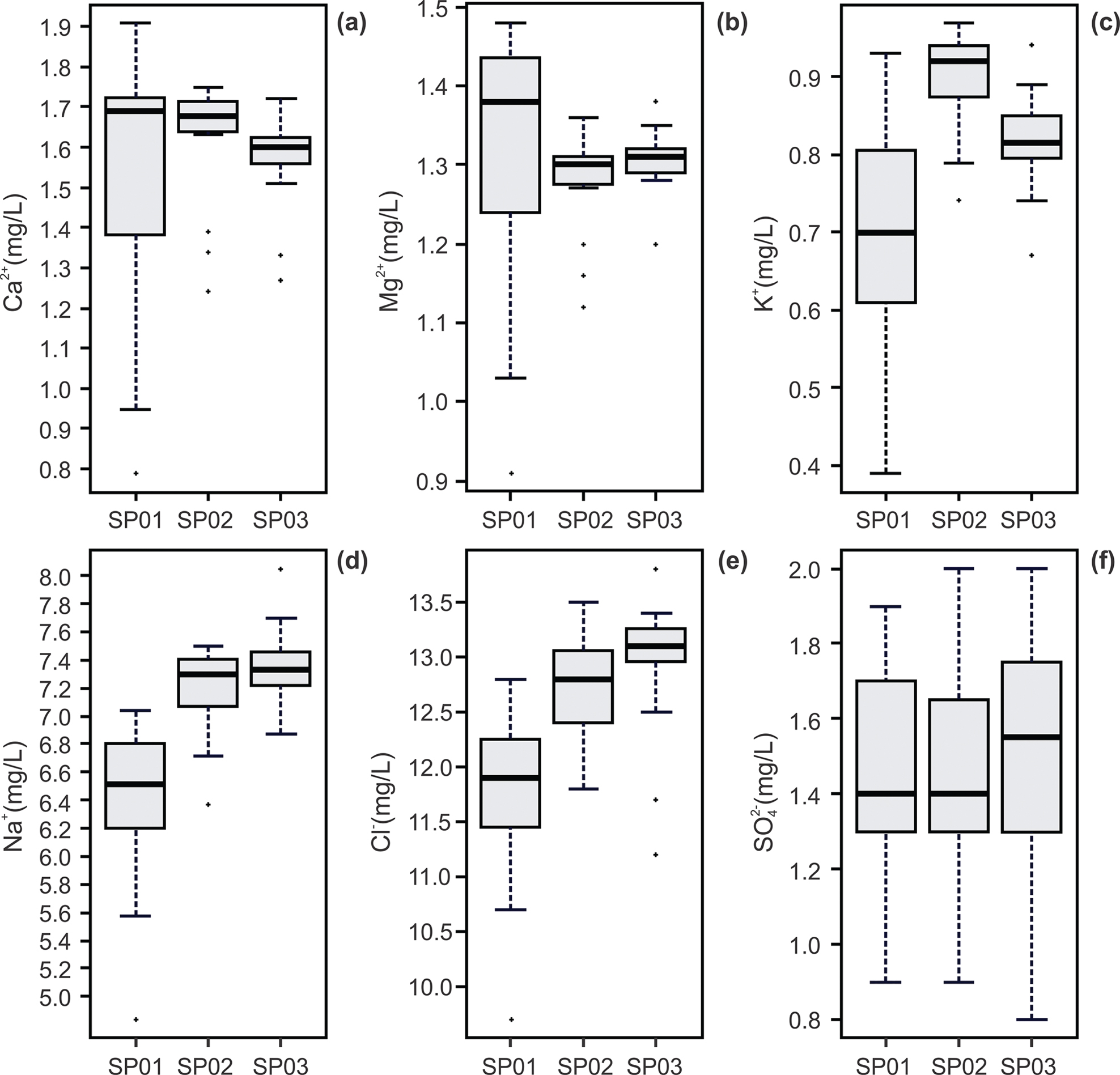 Fig. 3 Box and whisker plots for all major ions sampled along the SPR at SP01, SP02 and SP03, respectively, where (a) Ca2+, (b) Mg2+, (c) K+, (d) Na+, (e) Cl− and (f) SO42−. The boxes are bounded by lower and upper quartile limits, with the central line within the box representing the median values. The whiskers extend to the most extreme values within 1.5 times the interquartile range. Outliers are displayed by crosses.