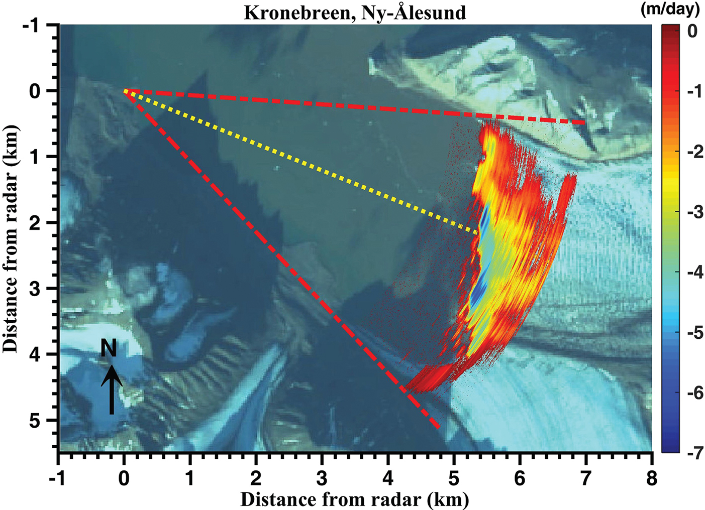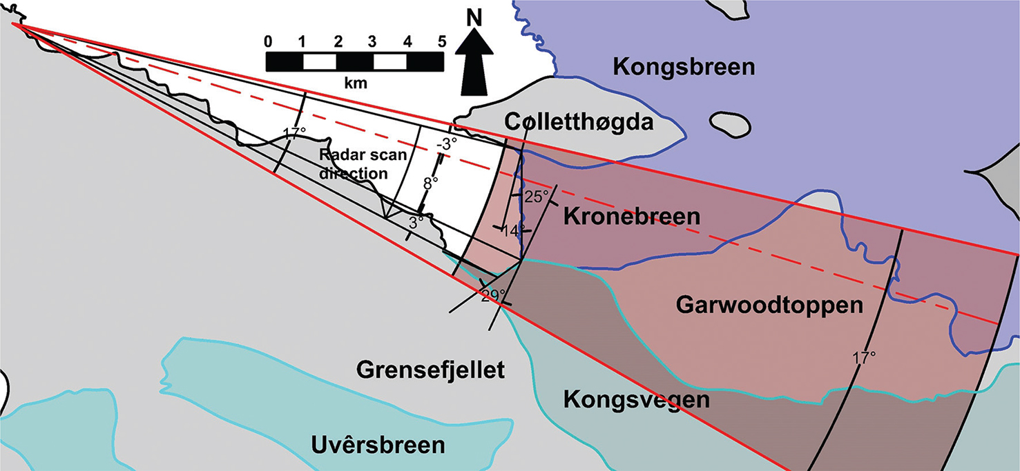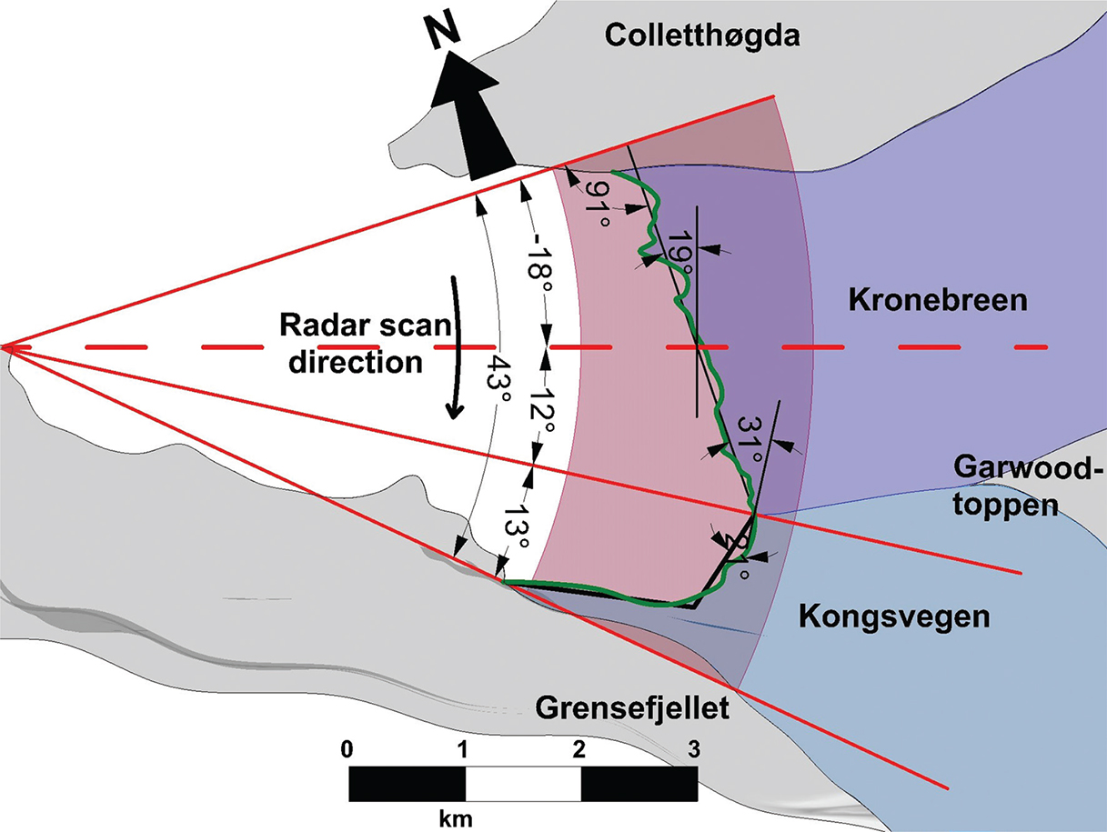 Fig. 7 Illustration of the measurement set-up at Pynten. The area illuminated by the radar is between the two outermost red lines. Only data within the red-coloured annular sector were saved. The black line drawn along the front of Kronebreen is the baseline used to calculate the offset between the direction of the radar waves and the glacier front and is taken to be perpendicular to the flow direction of the glacier. The glacier flows computed from the measurements are compensated by this offset angle. On the right-hand side, the offset is approximately 1°, and at the conjoining point between Kronebreen and Kongsvegen the offset is approximately 31°.