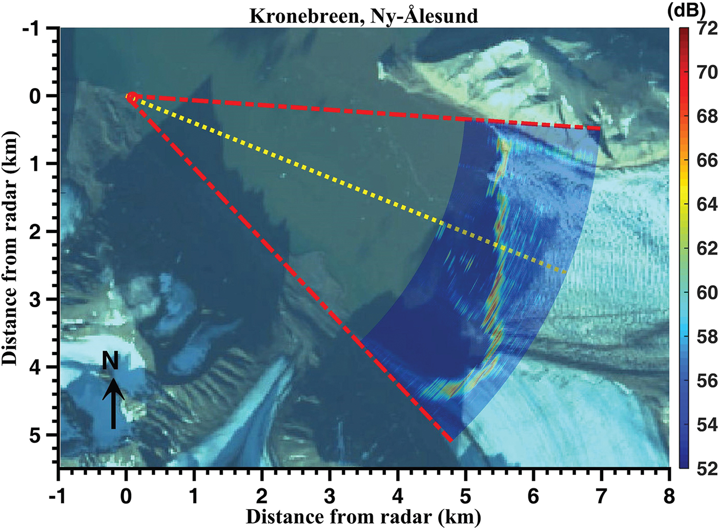 We reprocessed the radar data acquired in 2008 (Rolstad & Norland 2009) to compare it with the measurements made in 2017. The 2008 measurements were made from Pynten with a G-B real aperture radar operating at C-band with a pulse repetition frequency of approximately 1 Hz. The measurements lasted for 92 hr. For reprocessing, a time span of 13 hr, which included a calving event, was chosen for comparison to the near 13 hr of measurements in 2017 (Fig. 18).