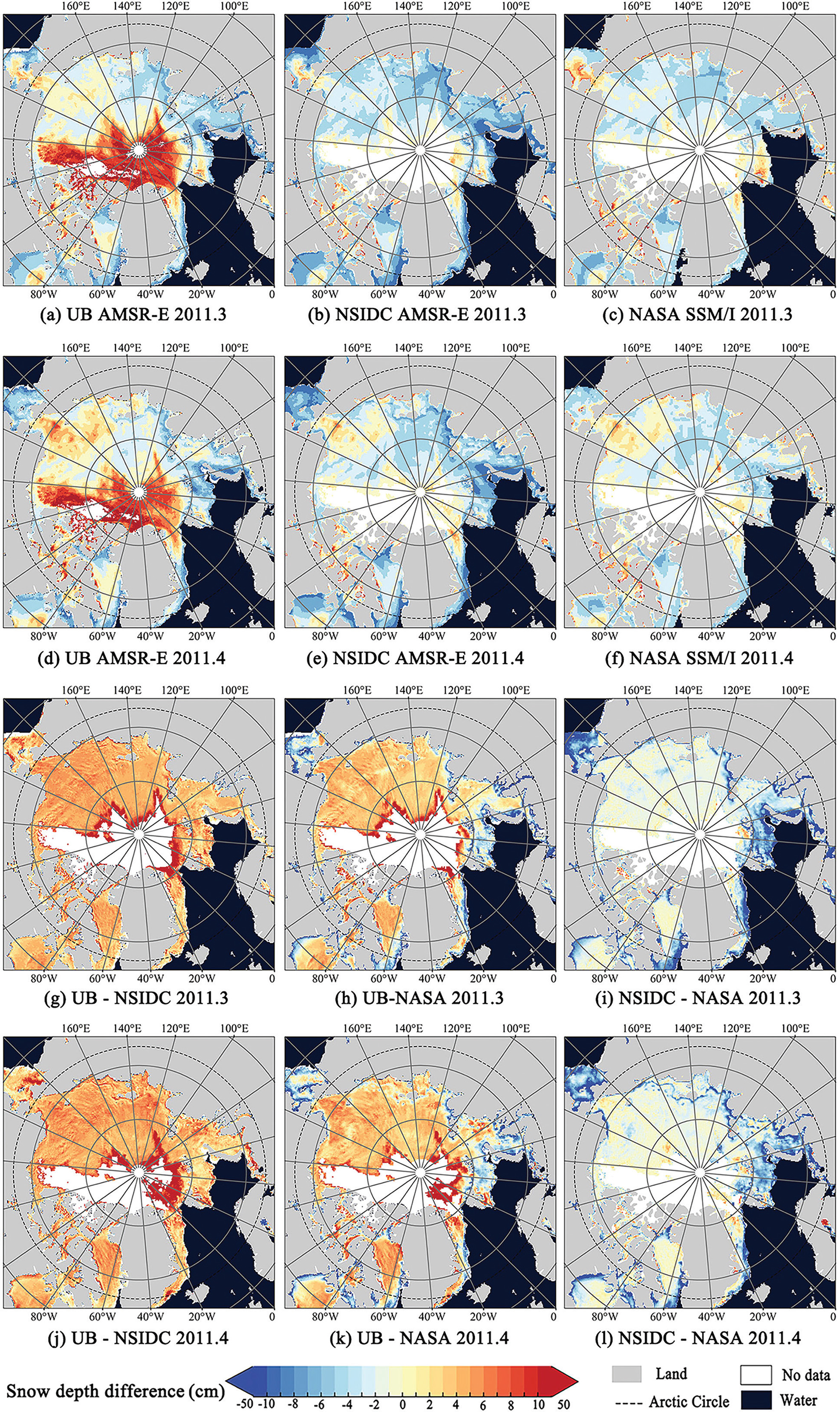 Fig. 10 UB AMSR-E, NSIDC AMSR-E and NASA SSM/I monthly average snow-depth distribution and their spatial difference in March 2011 and April 2011: (a), (b) and (c) are the monthly average snow-depth distribution of UB AMSR-E, NSIDC AMSR-E and NASA SSM/I in March 2011; (d), (e) and (f) are the monthly average snow-depth distribution of UB AMSR-E, NSIDC AMSR-E and NASA SSM/I in April 2011; (g), (h) and (i) are their spatial snow-depth differences in March 2011; and (j), (k) and (l) are their spatial snow-depth differences in April 2011.