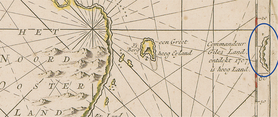 Fig. 1 Detail of van Keulen’s map (1714) with “Commandeur Giles Land” circled. See the supplementary file for more information about, and larger versions of, the maps referred to in this article.