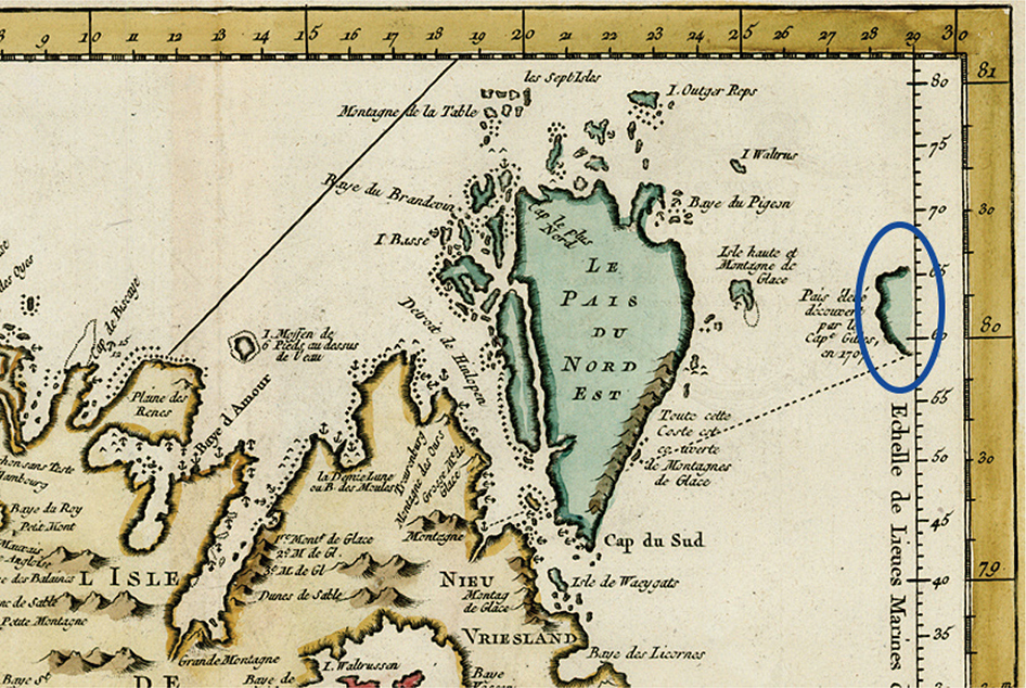 Fig. 3 Detail of Bellin’s map (1758) with “Land discovered by Capt Gilles in 1707” circled.