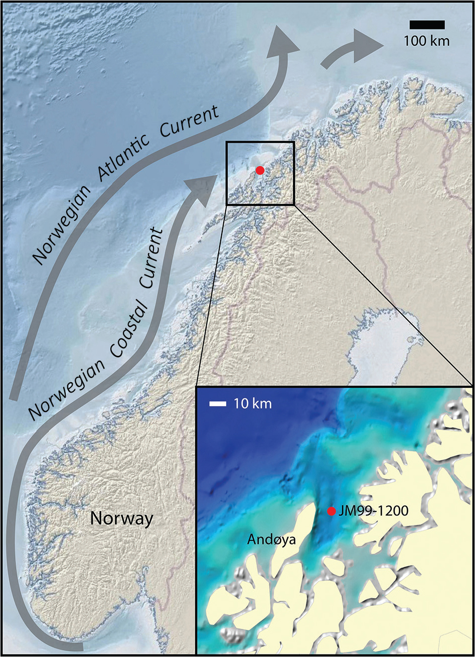 Piston core JM99-1200 was recovered from Andfjorden, northern Norway (69.16˚N, 16.25˚E; water depth 475 m; core length 1115 cm), on board the RV Jan Mayen in November 1999. Andfjorden is at present under the influence of two current systems: the warm and saline Norwegian Current (the continuation of the North Atlantic Current, also called the Gulf Current) and the overlaying shallow (50–100 m) Norwegian Coastal Current (Fig. 1). The latter originates from the brackish Baltic Sea and is nourished by low salinity water from the fjords and river discharge as it moves northward along the coast. According to Hald & Vorren (1984), SSTs in Andfjorden vary in August between 9 and 12 °C and in February between 2 and 6 °C, which is in great contrast to the Arctic and icy conditions during the Younger Dryas stadial, when the Norwegian Coastal Current had not yet developed. The coring site is situated in a glacial trough at the mouth of an open sound, relatively close to shore but not in a restricted fjord setting.