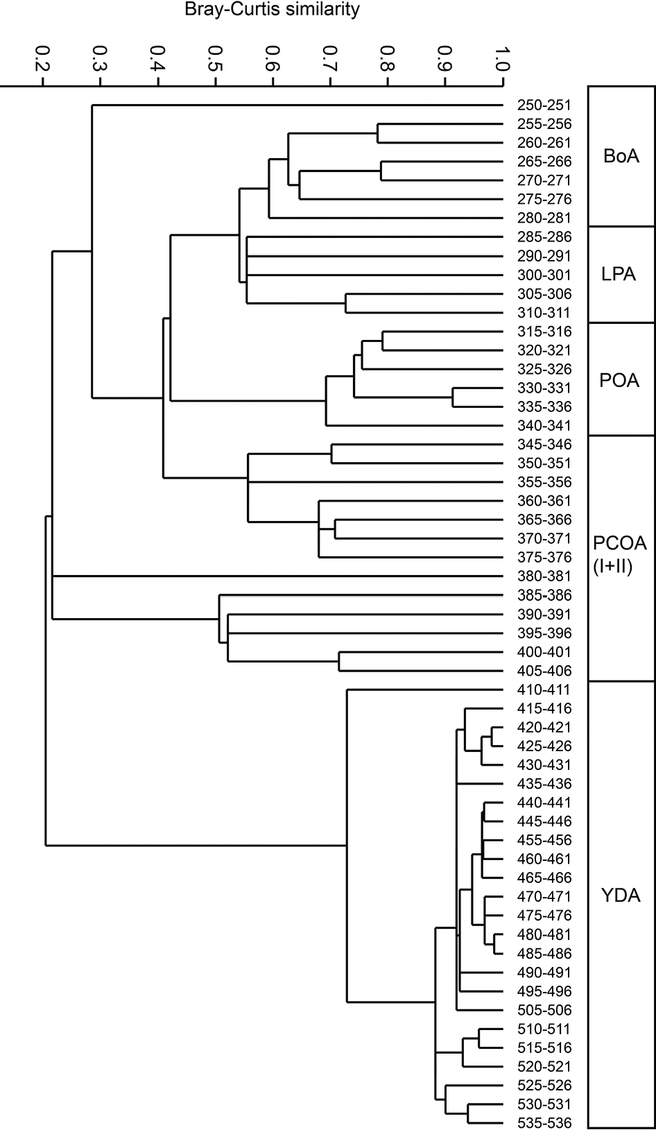 CA 2 discriminates mainly the post-YDA samples. There is a relatively clear trend from the oldest PCOA samples (405–385 cm) having the most negative CA 2 scores, to the youngest BoA samples (260–250 cm) with the most positive scores. The CA 2 scores do not correlate with inferred palaeotemperature but may reflect another environmental parameter.