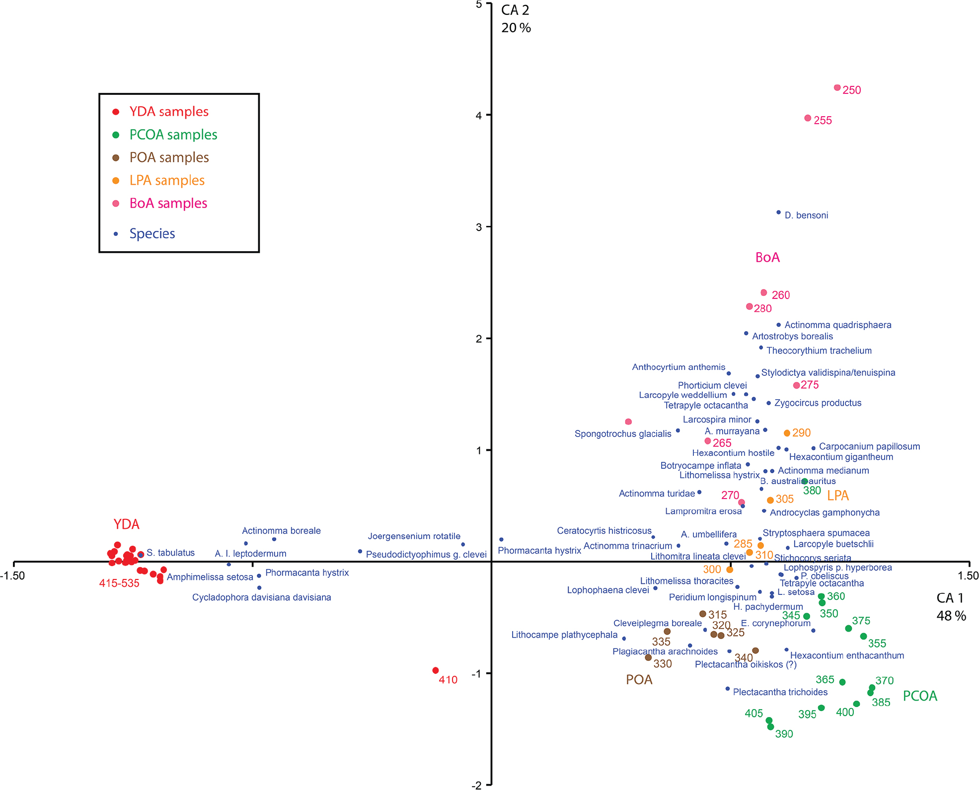 All the YDA samples (535–415 cm) cluster tightly at the left end of the plot (negative CA 1), while the younger samples are found at the right (positive CA 1). The 410–411 cm sample is transitional between these two groups. Taxa associated with the YDA samples in the plot include A. setosa, Sethoconus tabulatus, C. davisiana davisiana, Actinomma leptodermum leptodermum, Phormacanta hystrix and A. boreale. It may also be noted that among the younger samples with positive CA 1, the POA samples (335–315 cm) have the smallest scores. Comparing with the temperature analysis described above, it is natural to interpret CA 1 as loosely reflecting water temperature.