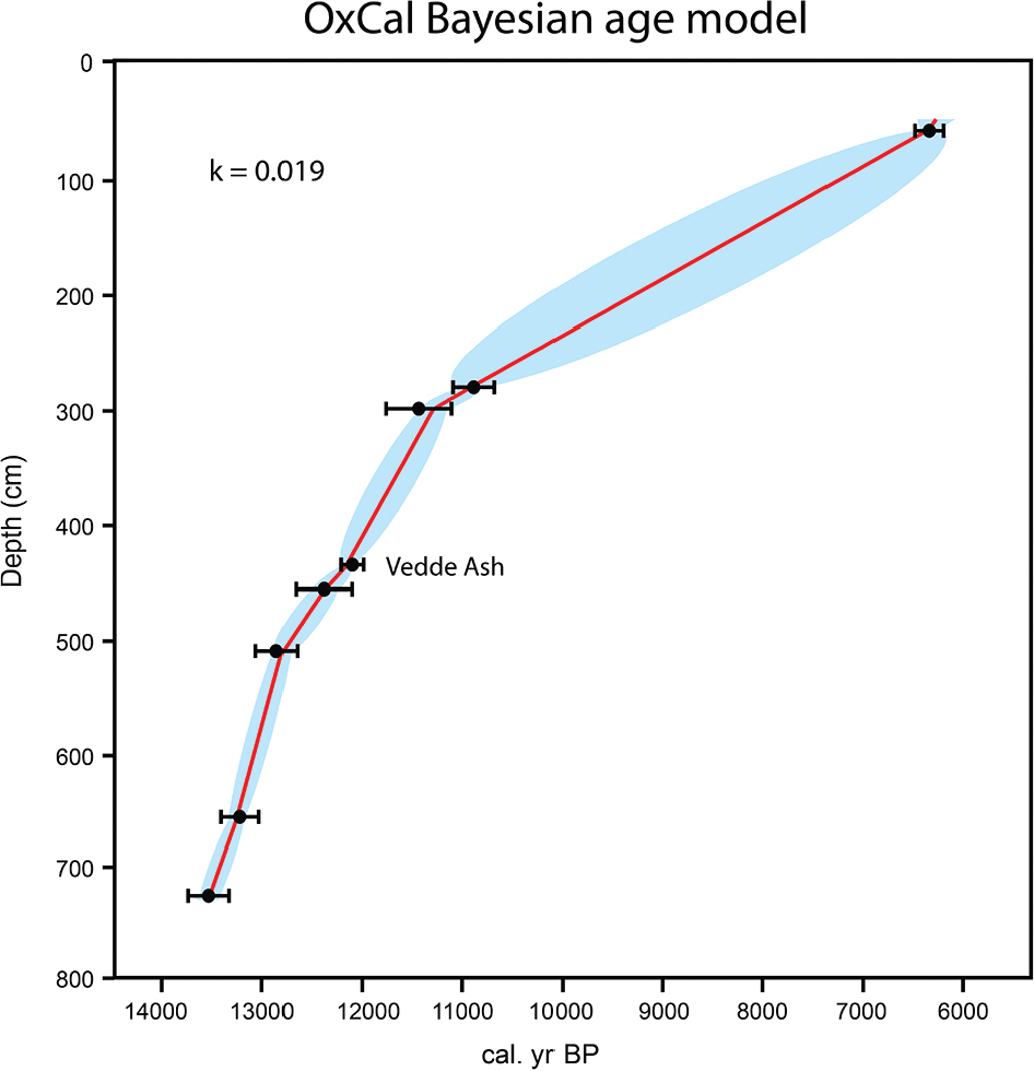In this article, we have made some small adjustments to the age calibrations (Table 1), with the Marine13 calibration curve and using the delta R values of Cabedo-Sanz et al. (2013). The calibration was carried out with OxCal version 4.3 (Bronk Ramsey 2009). The Vedde Ash has been moved from 11.980 to 12.121 cal. Ky BP according to GICC05 (Rasmussen et al. 2006), with a two-sigma error bar approximated by the total maximum counting error in GICC05 (Andersen et al. 2006). Relatively large error bars in the calibrated ages at 300.5 and 457.5 cm are due to plateaus in the Intcal13 calibration curve at ca. 11.5 and 12.3 ka BP (Reimer et al. 2013).