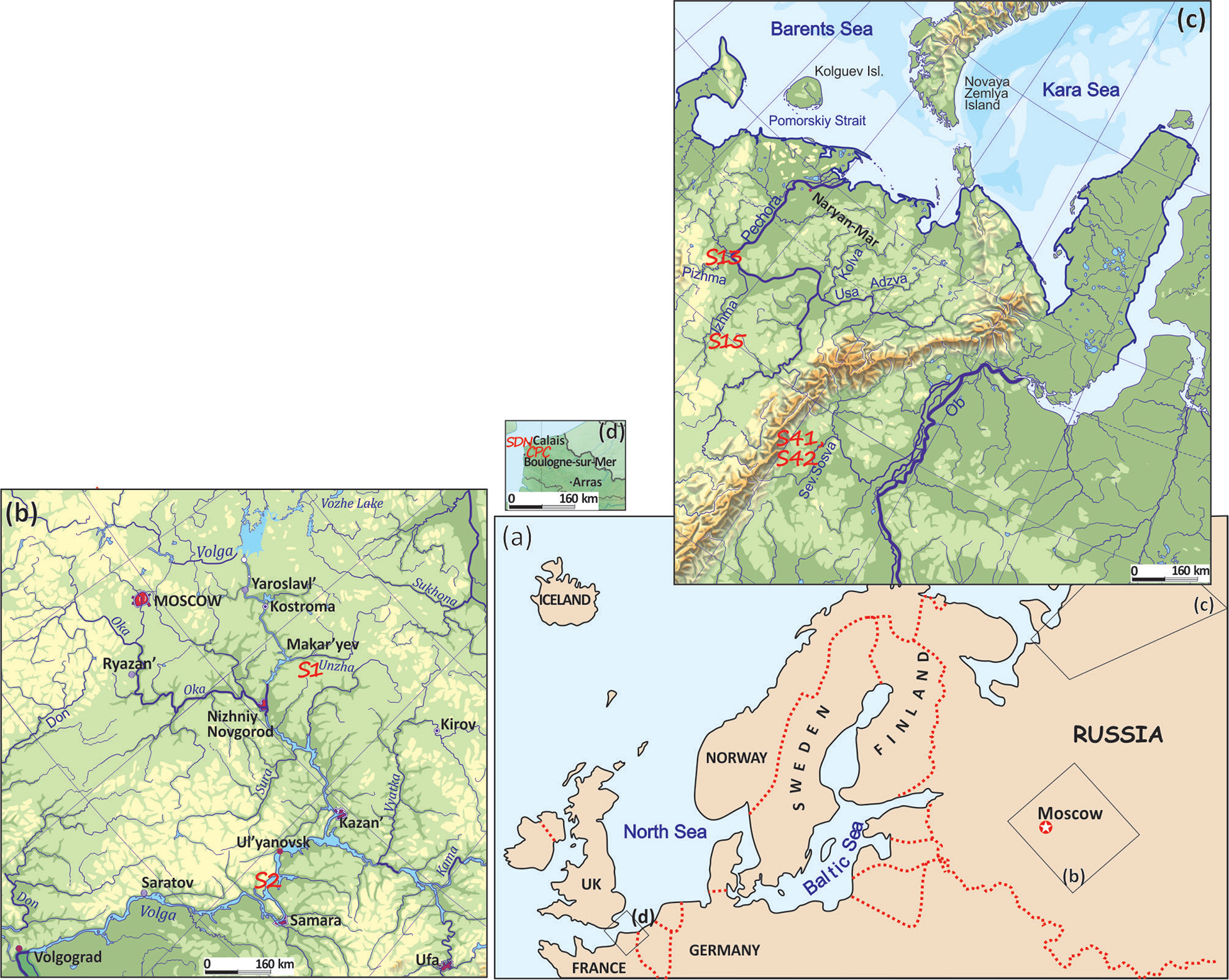 Fig. 1 (a) Map of the northern Europe and Western Siberia; (b) central part of European Russia, with locations of Makar’yev (S1) and Gorodishche (S2) sections indicated; (c) northern part of European Russia and Western Siberia, with locations of Vyatkina River (S13), Izhma River (S15) and Lopsiya River (S41–S42) sections indicated (d) western Europe (Boulonnais Region).