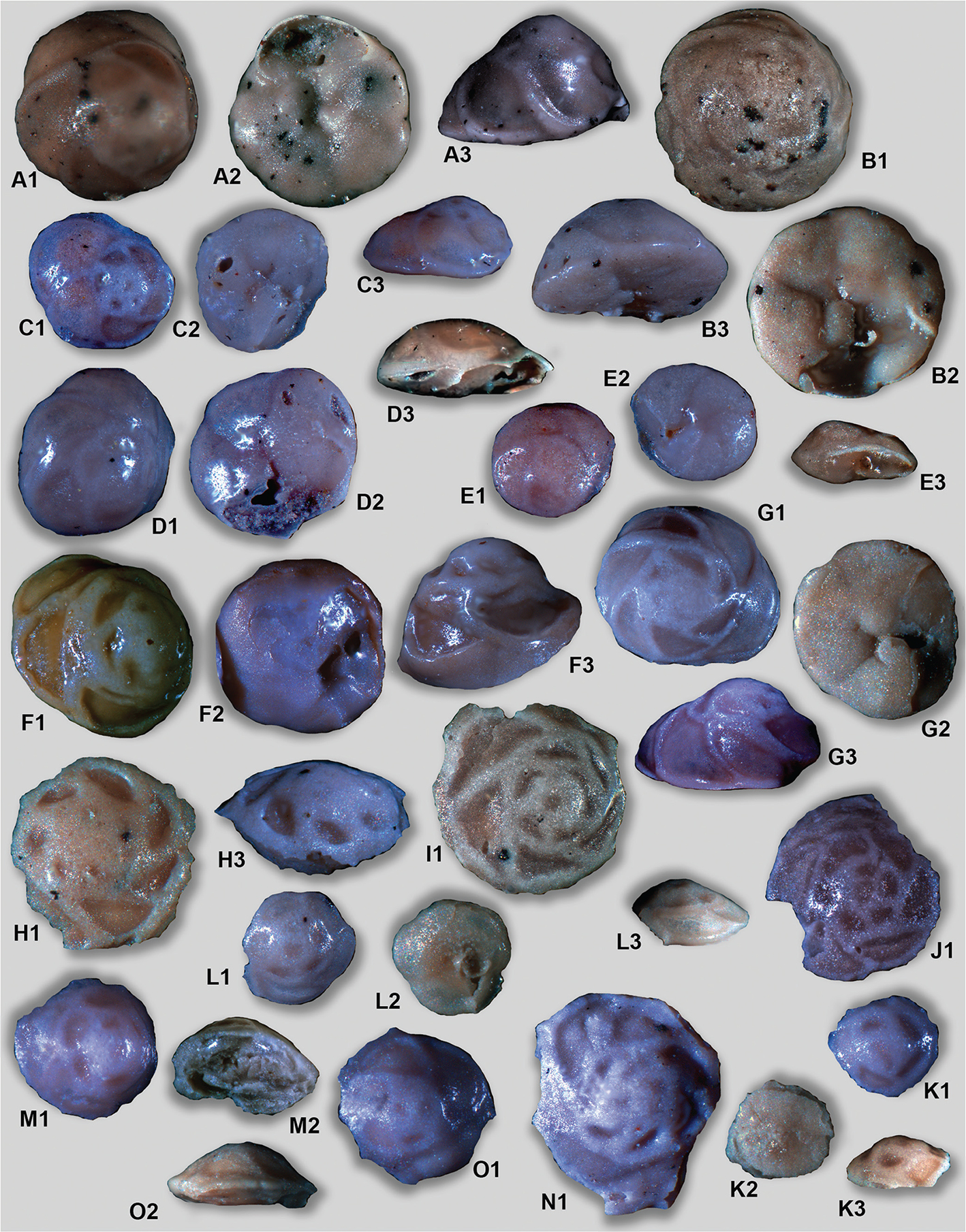 Fig. 3 Dorsal (1), ventral (2) and lateral (3) views of Pseudolamarckina pseudorjasanensis Dain, 1967 specimens in the Lower and Upper Kimmeridgian of the central and northern European part of Russia. A–G: uppermost Lower Kimmeridgian specimens, Makar’yev Section (S1) (Colpaert et al. 2016; Colpaert, Nikitenko et al. 2017). A–E: bed 2, sample 3. F–G: bed 1, sample 24. H–M: upper Kimmeridgian specimens of the Izhma River Section (S15) (Mesežnikov 1984). H–M: bed 3, sample 114. N-O: uppermost Lower Kimmeridgian specimens, Vyatkina River Section (S13). N–O: top of the bed 7, sample 146. Specimens are shown at the following magnifications: A–B (A is microspheric form) × 68; C–E (C, E are juvenile forms); F–G × 42; H–O × 56 (J is megalospheric form; K, L are juvenile forms).